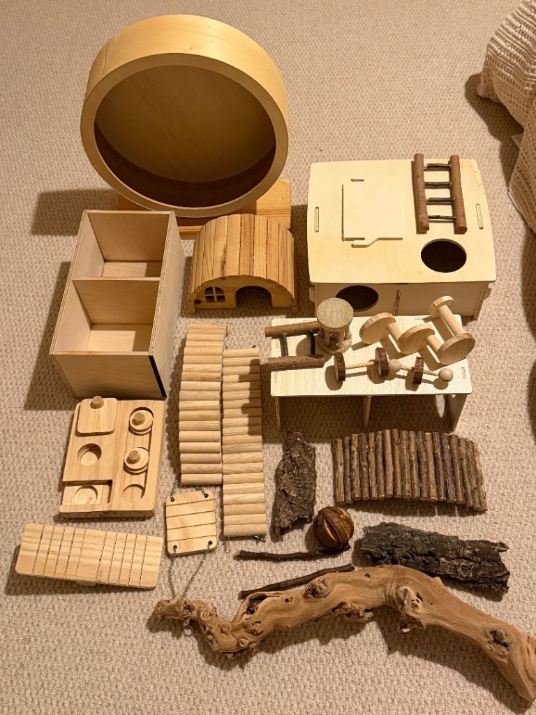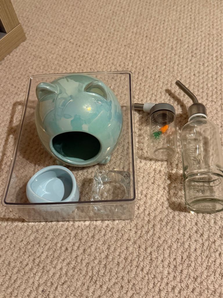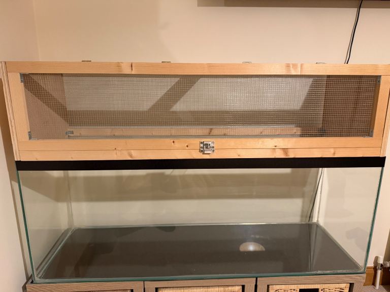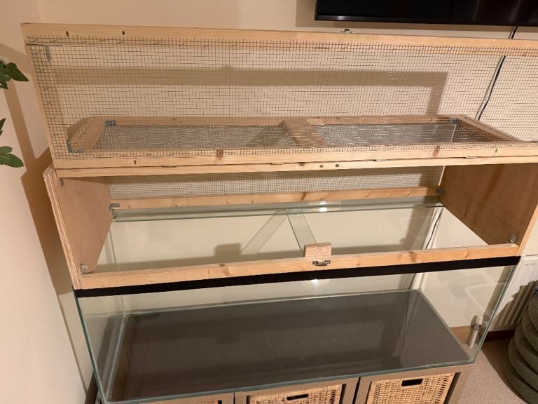 Custom made glass hamster cage with custom made wooden upper to add 30cm height to allow for plenty bedding for burrowing and for various level options/larger toys/structures. Comes with original glass cage lid. (Please note the sale doesn’t include the three storage boxes that it’s sitting on). The buyer may take any of the accessories and bedding shown in the photos for free if they want them.