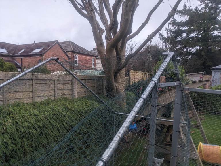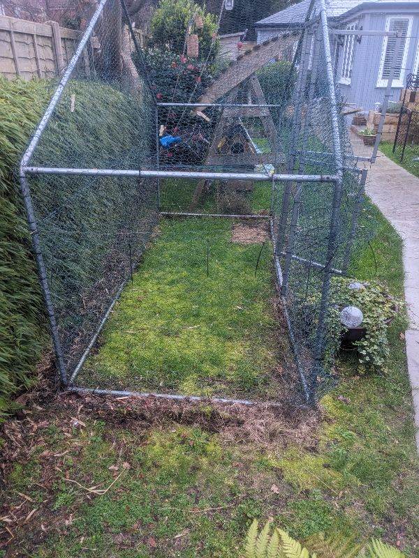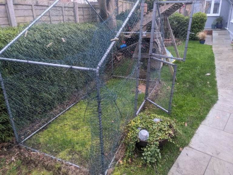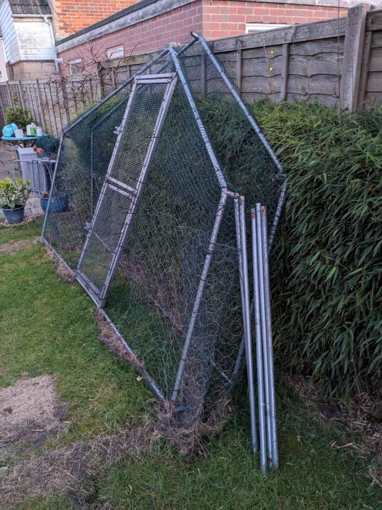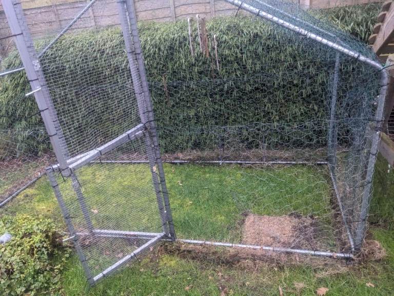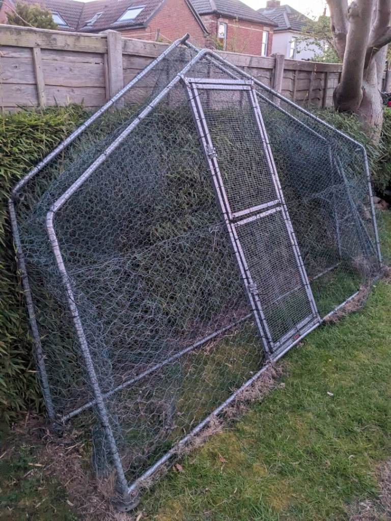 2m x 3m walk in animal enclosure. Disassembled into two main sections and poles. See photos. These show it as 1m x 3m, but it has the poles to extend out.