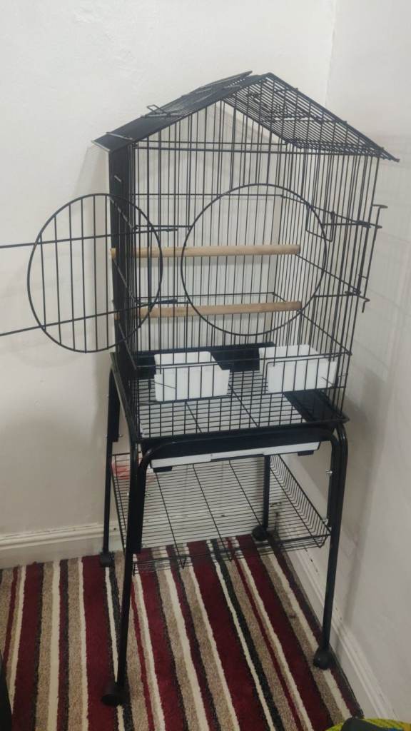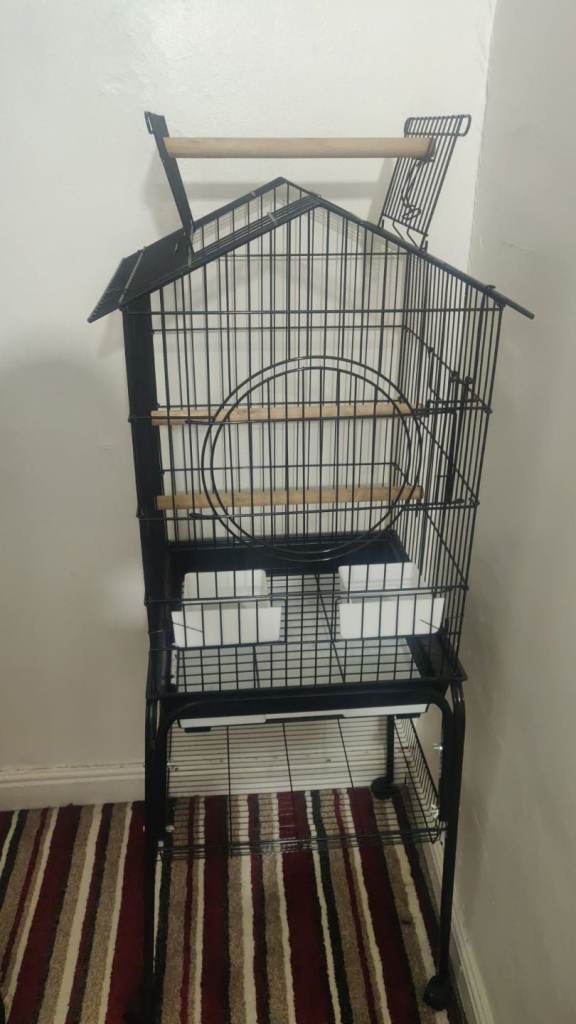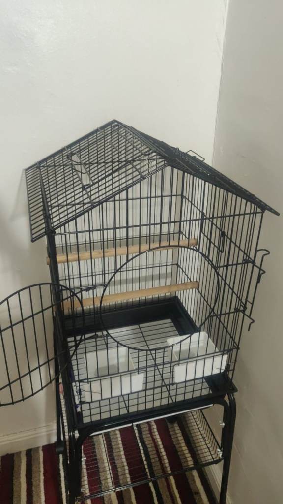 Brand new parrot cage for sale, complete with a sturdy trolley stand. The cage features a convenient pull-out tray for easy cleaning and a roof that opens with a bar, allowing your bird to perch on top and enjoy more space outside the cage.