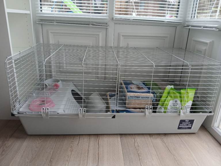 Large rabbit cage, comes with 2 water bottles, 2 bowls, full bag of sawdust and bag of hay
