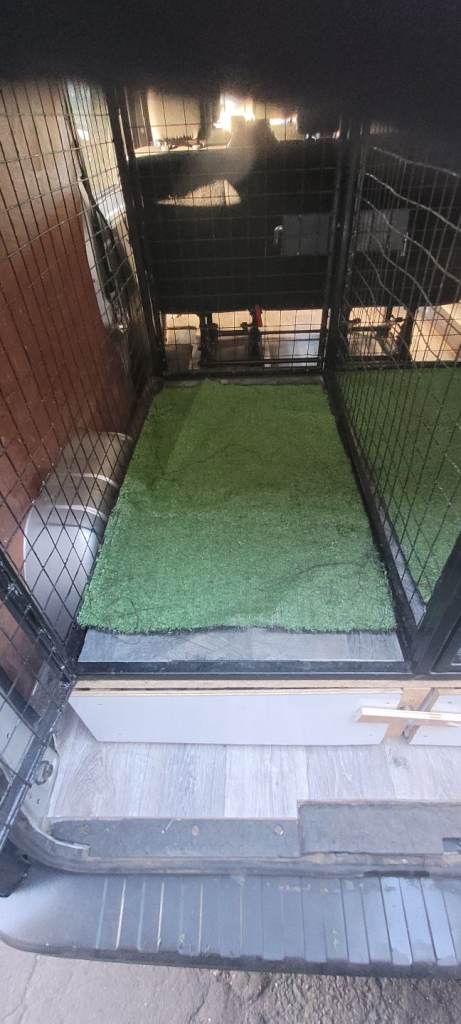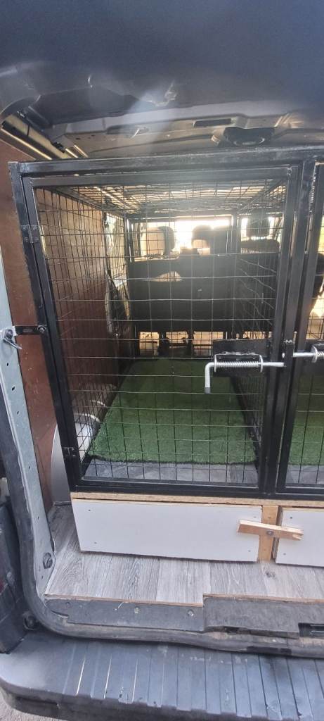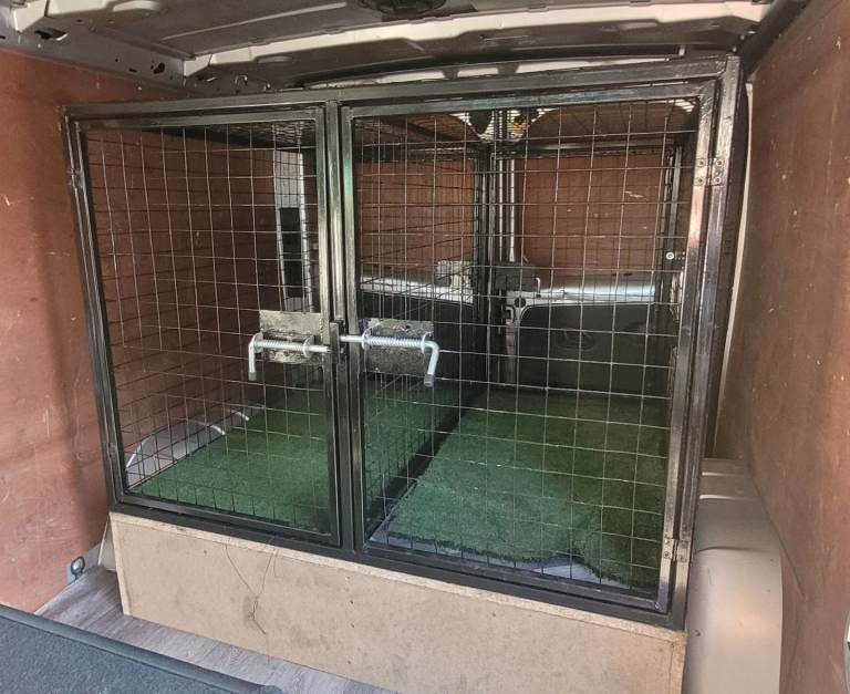 Large dog breed cage for van built for renault trafic/ Vauxhall vivaro but will fit other vans. It has front and rear opening and removable bottoms for cleaning.