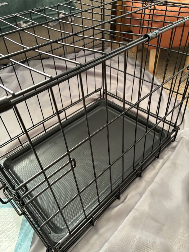 My puppy preferred her larger crate.Used twice.Has a removeable tray underneath excellent condition