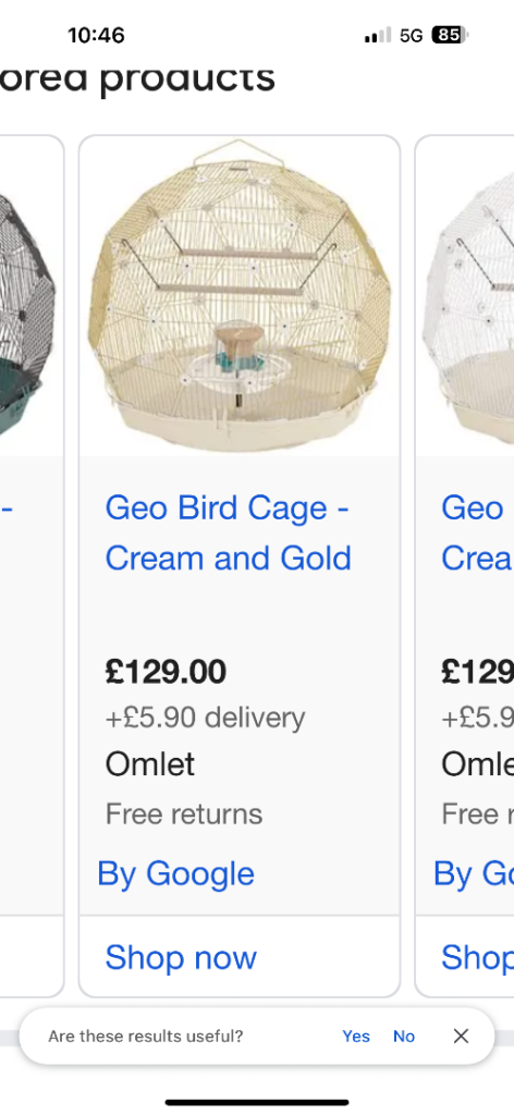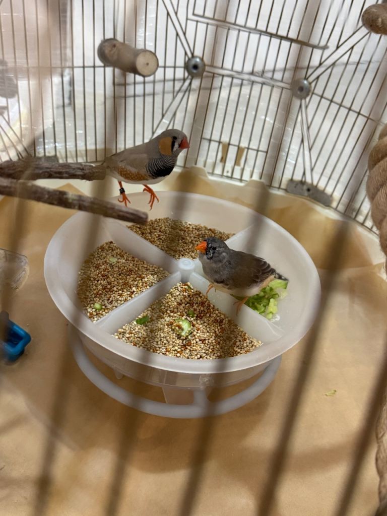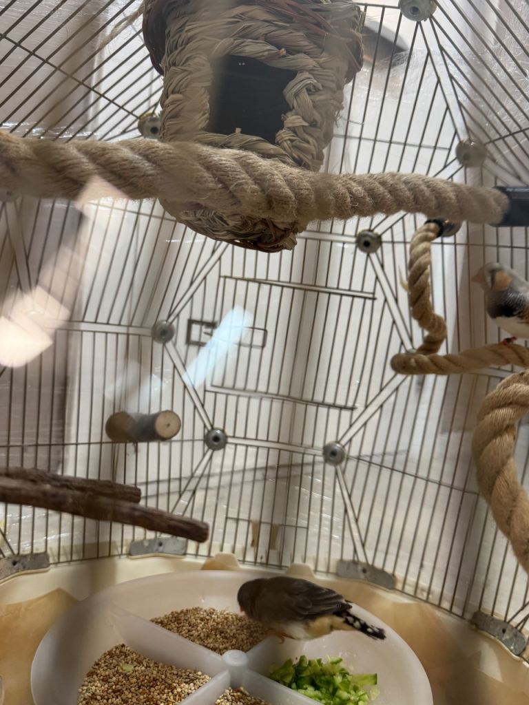 Beautiful Omlet Geo bird cage in cream and gold, comes with a matching tall stand. The cage is in excellent condition and very clean. A healthy pair of Zebra Finches is included with the cage. They are currently nesting and well cared for. Perfect setup for bird lovers.