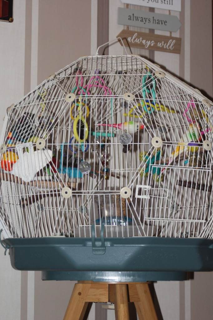 In great condition, doesn't include the toys or our budgie but will come with 6 half perches and one full length one. This cage has a central feeder, water station with a catcher for waste food. Has built in mirror and will come with a pack of floor liners. Cost over £200 but we have moved into a smaller property and it is to big. Suit up to 2 budgies or smaller birds. Will be cleaned out prior to sale. Stand collapses for ease of transport.. Geo Bird Cage: 62cm (H) x 60cm (W) x 60cm (D)