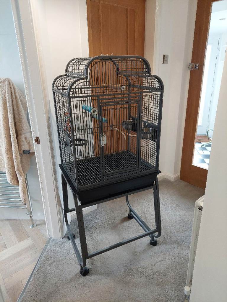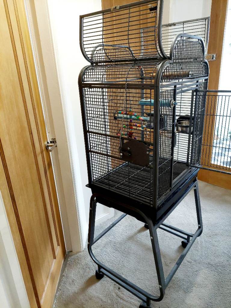 Large open top bird/parrot cage in good clean condition. Also comes on stand with wheels, food and water bowls.