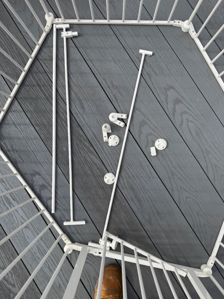 There are 6 panels locked together but foldable and each is 60cm long. The fence extends to 3.6 m and comes with fittings to attach to the wall. It all comes apart very easily so can be assembled in minutes and removed again when not required. One of the panels has a gate built in.