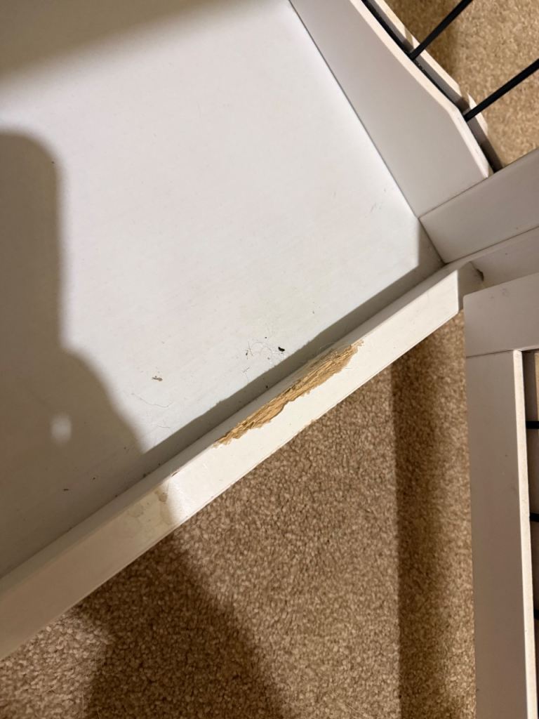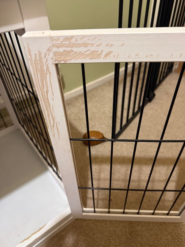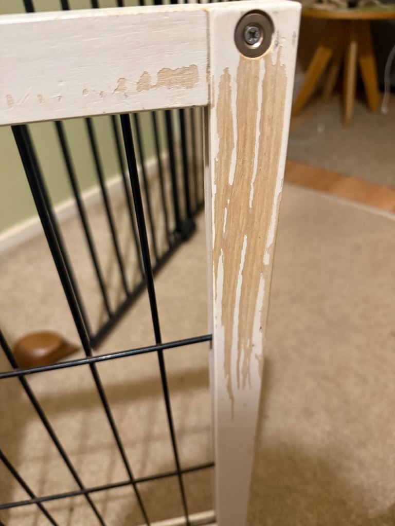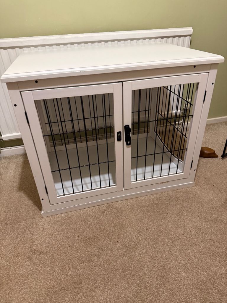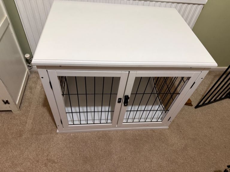 Solid wood furniture dog crate , with side and front opening . Have a few scratch marks to