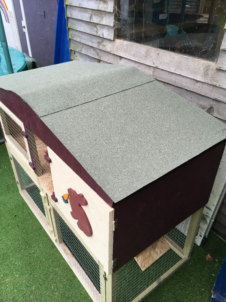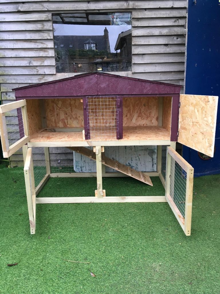 This hutch is suitable for both rabbits and guinea pigs. It is 64cm deep, 125cm wide and 100cm high. It has a ladder so the animals can go up and down as they please. There is a separate enclosed sleeping area. There are 4 doors for ease of access and cleaning. The hutch is made with hard wearing osb board and painted with Cuprinol shades, the wood is treated and the mesh galvanised. I also make runs that you can attach to the hutch. Any questions please feel free to get in touch.