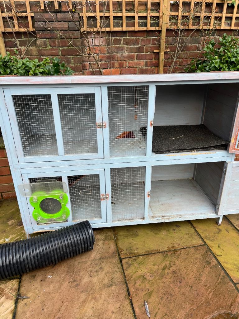 Rabbit hutch - double tier, plenty of space for 2 bunnies or guinea pigs. My rabbits were litter trained so floors in great condition. There are 2 edges of the hutch where bunnies would chew the wood next to the doors but still in great condition. The hutch has been kept in a summerhouse so no weather damage. There is a water stain on top of the felt roof where water has been spilled from water bottles but absolutely no damage. The roof also lifts off.