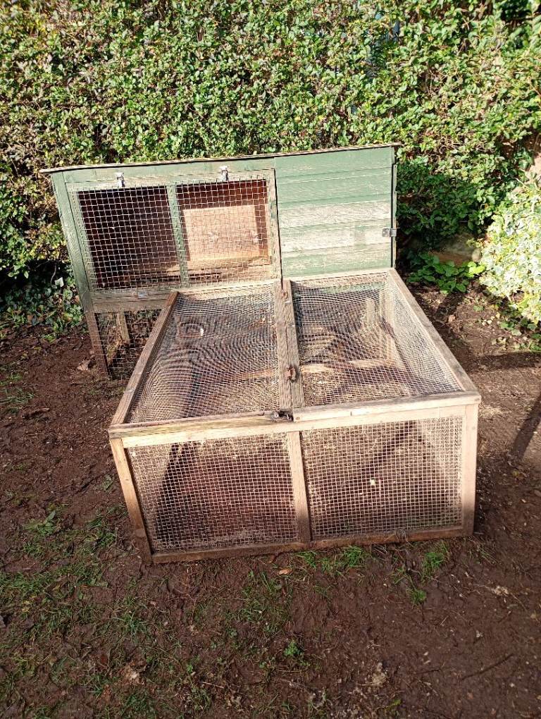 Two tier rabbit hutch with bed area and attached run. Well loved but still has life in it.