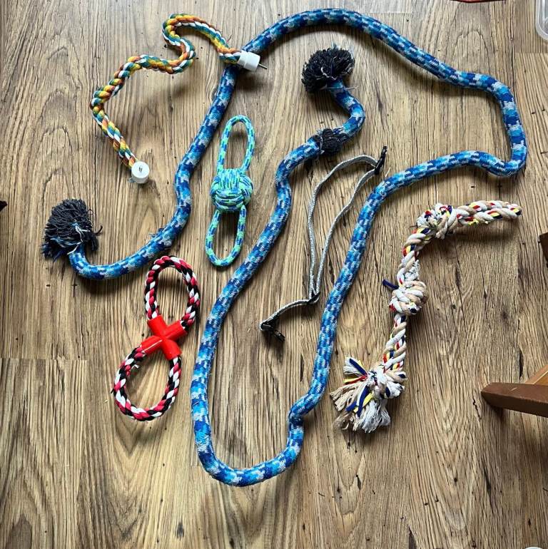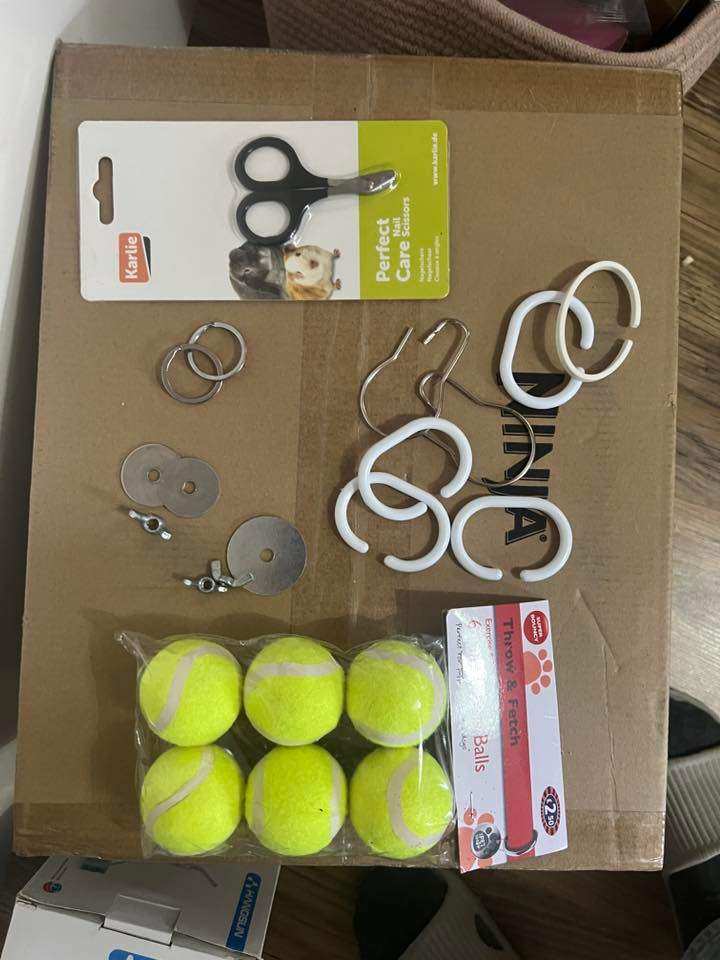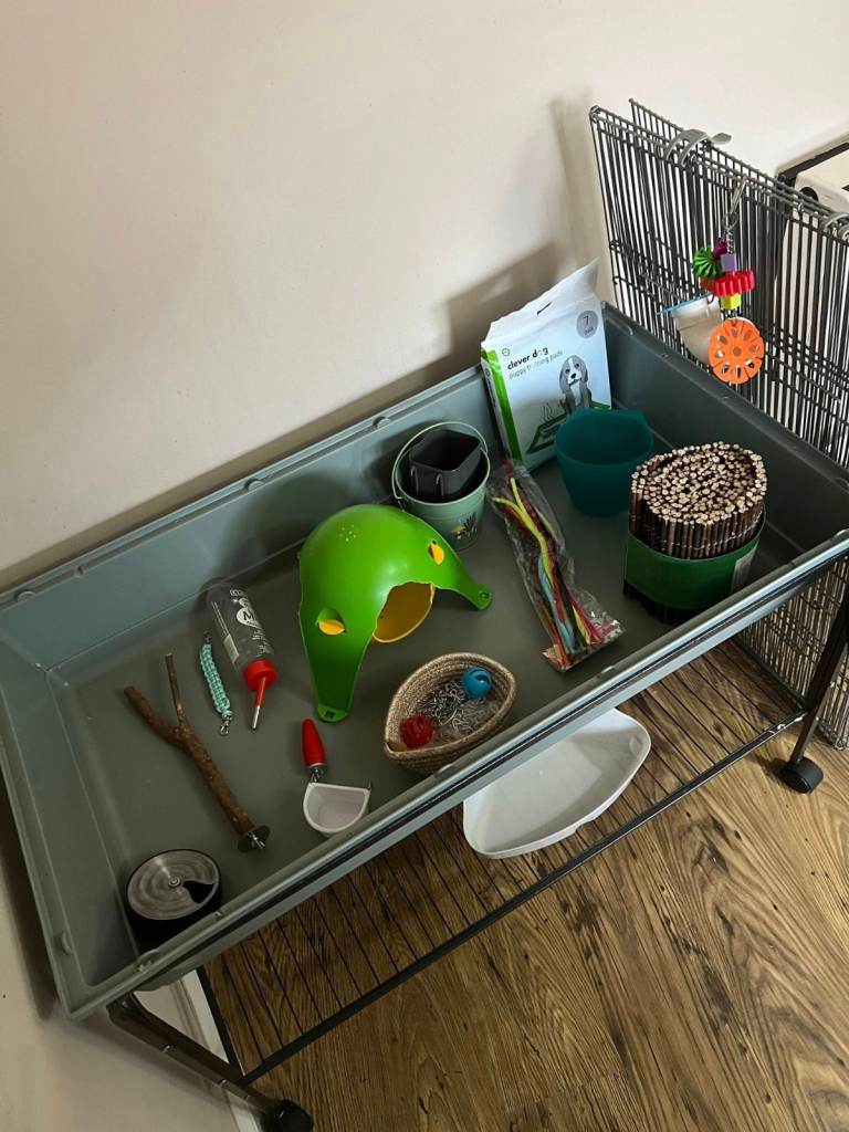 - Coco Large cage with stand: 100cm (W) x 54cm (D) x 70cm (H) with assorted accessories and enrichment, including foraging toys (barely used), loose clips, assorted ropes, water bottle with holder, screw-on toilet tray (only used for one week), and more! See photos for reference.