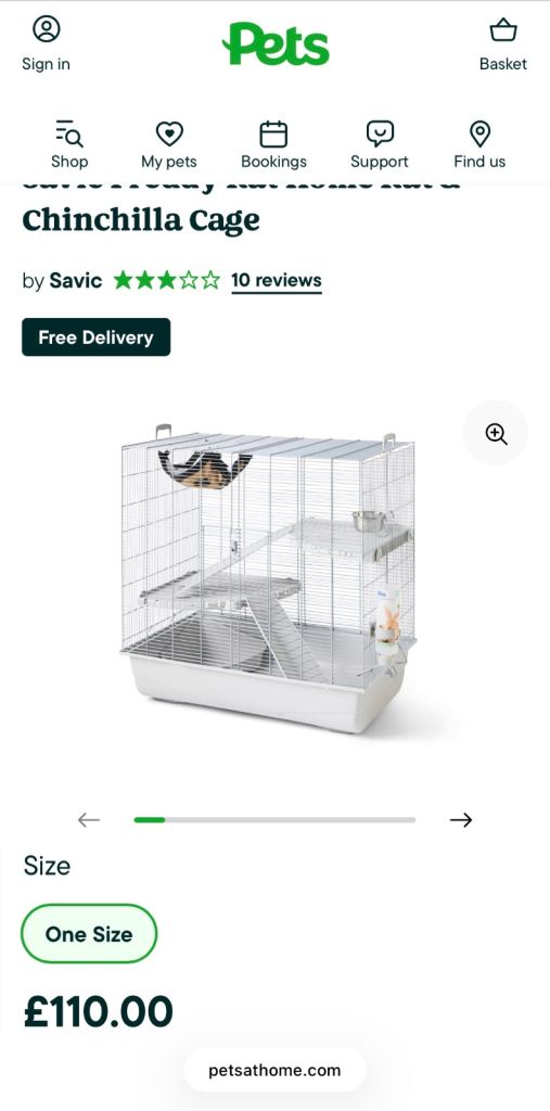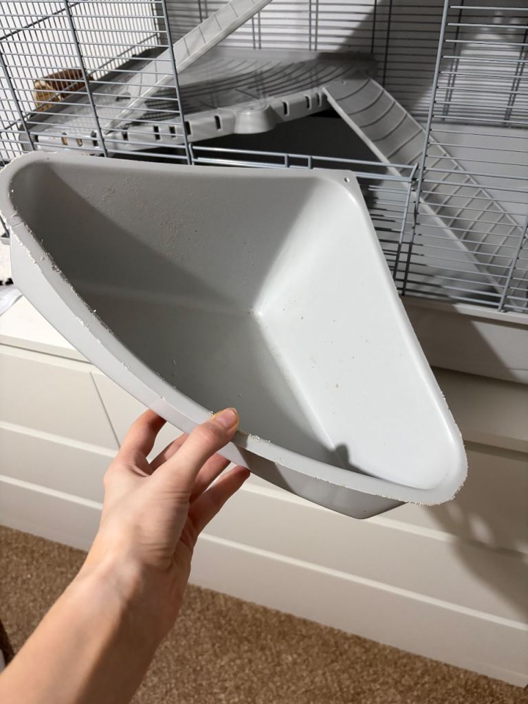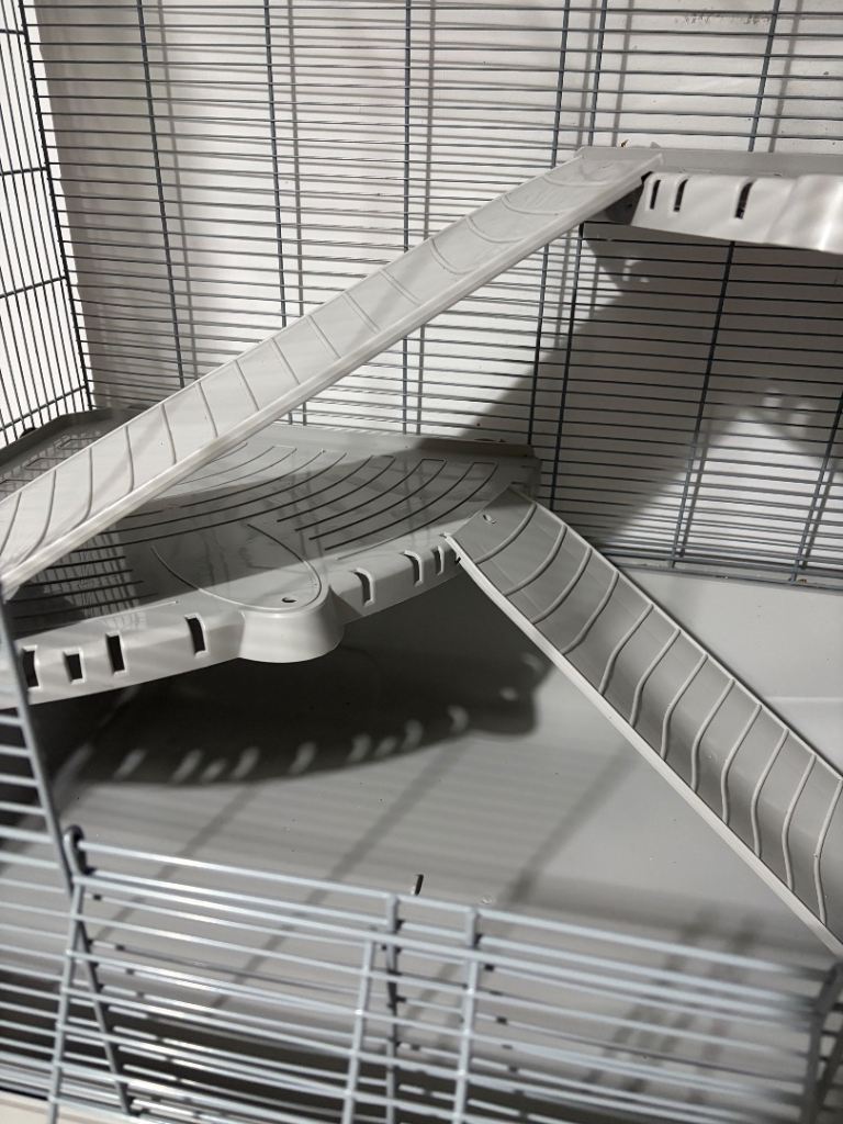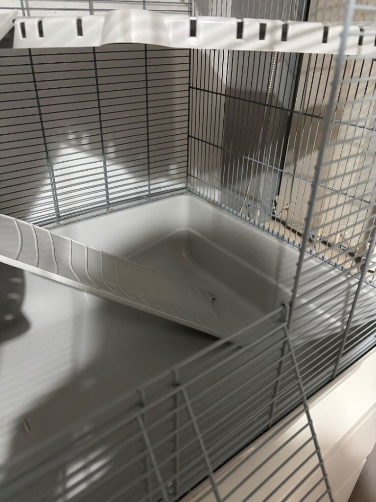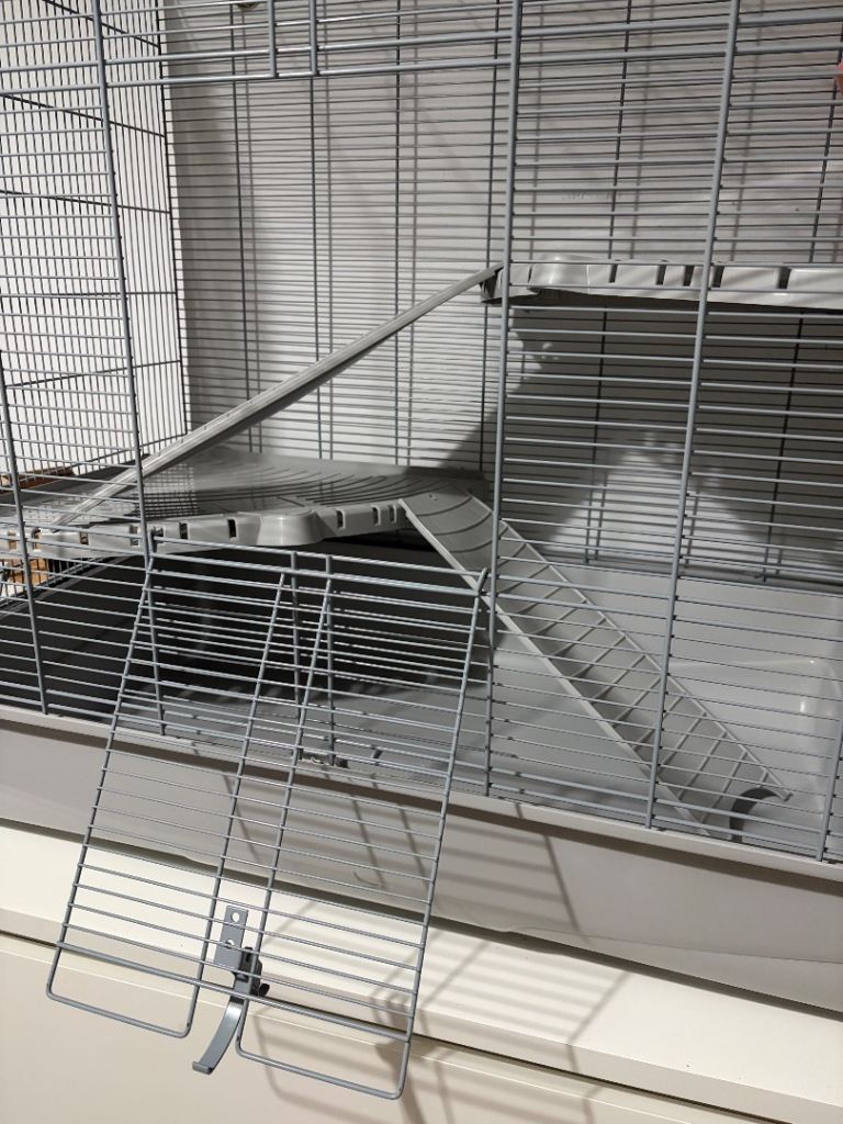 ‘Freddy’ Cage from PetsAtHome RRP £110. I’ve had it for a couple of months but upgrading to a bigger cage. It’s in great condition, has two handle bars at the side, one hatch at the front, two platforms and ladders, plastic litter tray, plastic food bowl, and a large water bottle. Everything in great condition but the plastic toilet bowl has been chewed on the edges (see picture)