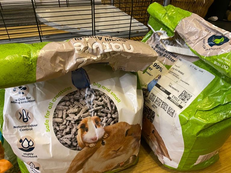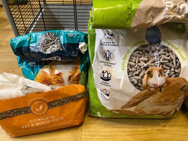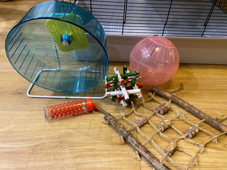 Small animal cage with removable trays, water bottle, exercise wheel and ball. Size: H 71cm x L 78cm x W 48cm