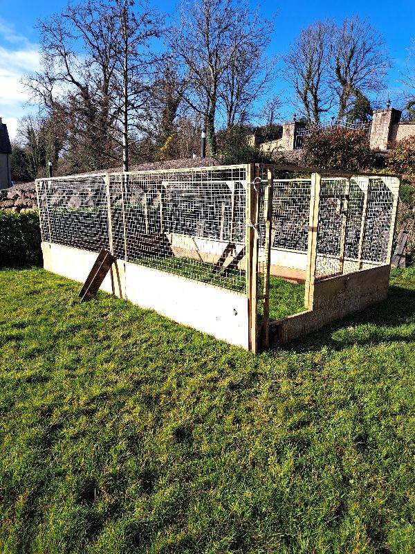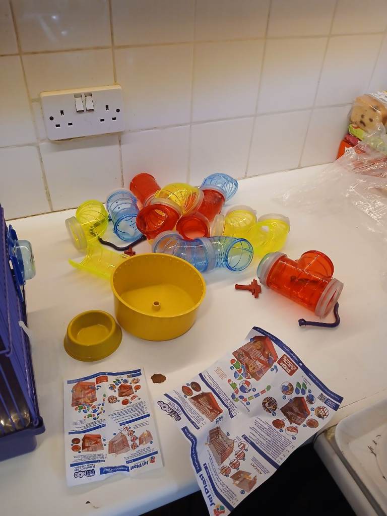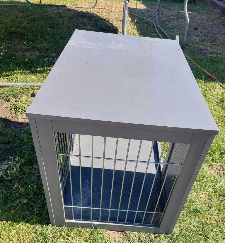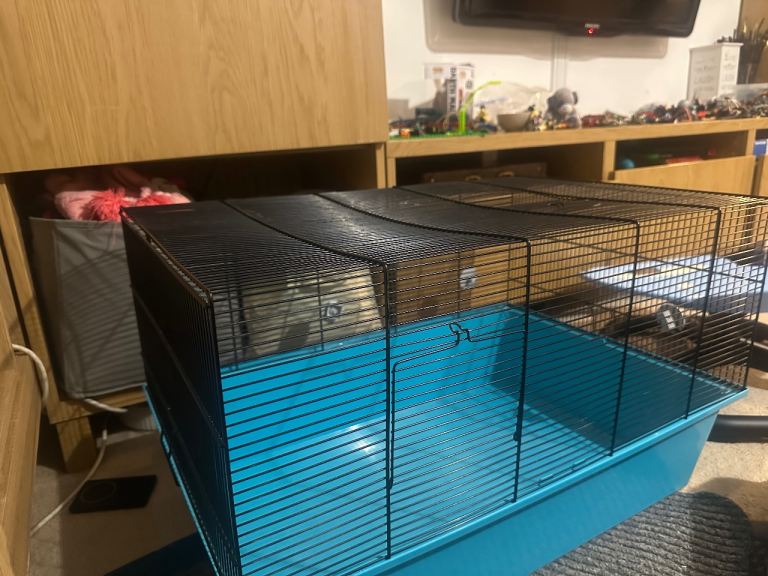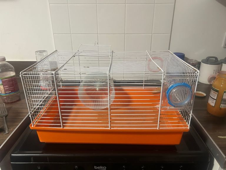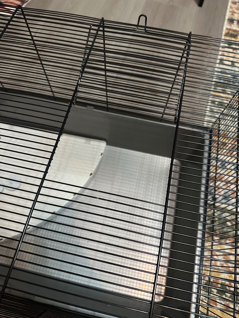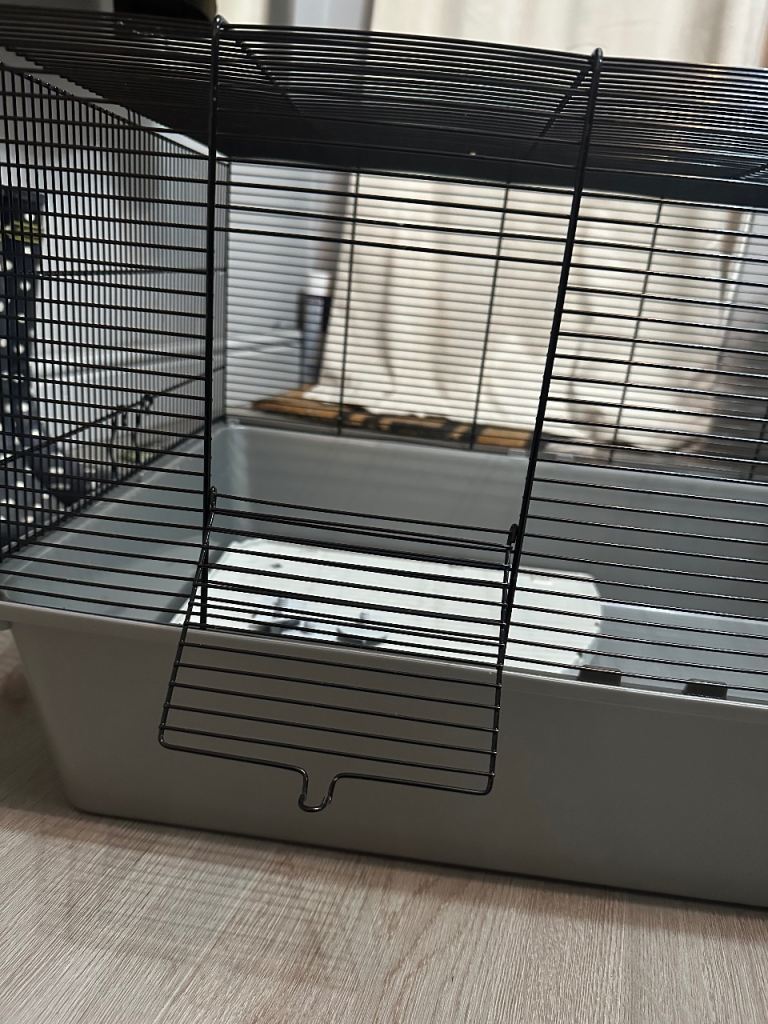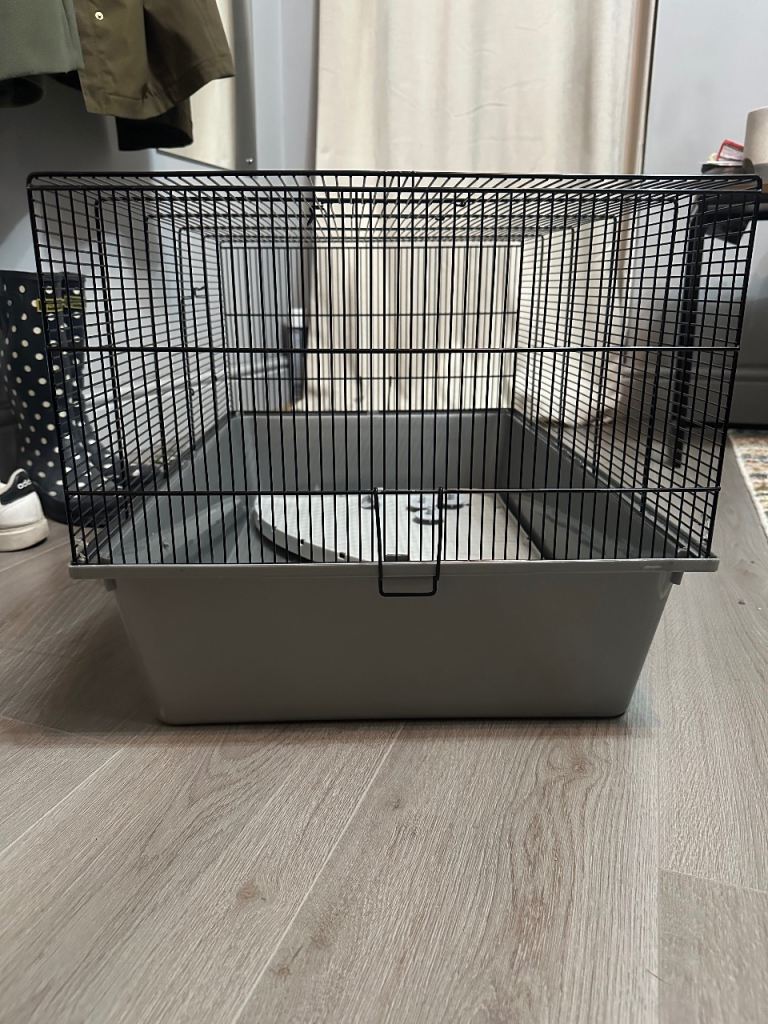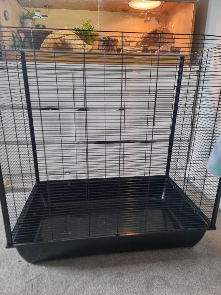 Deep plastic base. Narrow met wired bars with 2 doors (one side, one top)