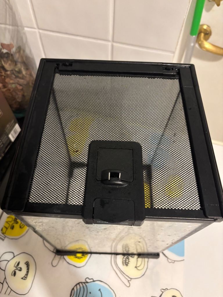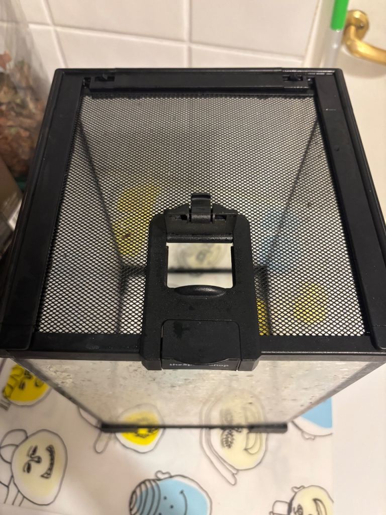 20x20x30cm, only used once for a mantis, i will give a clean before pick up. has a feeding hole