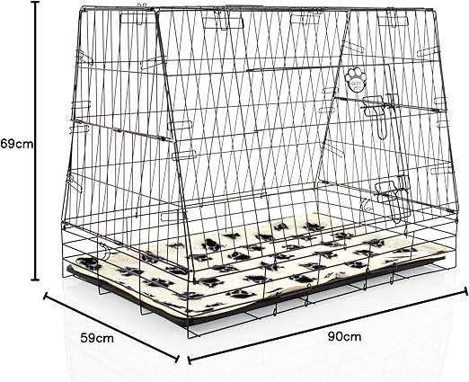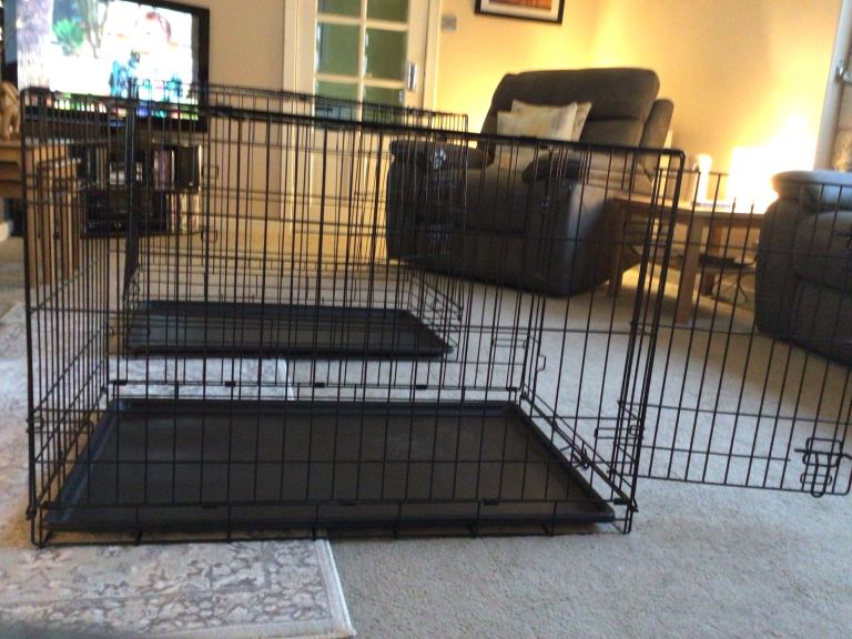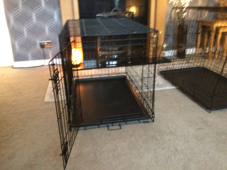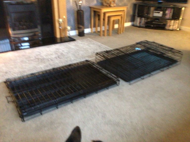 Two dog crates which we bought for our German Shepherd puppy, in perfect condition. They are both size medium. The straight sided one is designed for the home, and the angled is suitable for the back of most SUV cars, we used it in our Mercedes cla. Probably too tall for an estate car. They are less than three months old.
