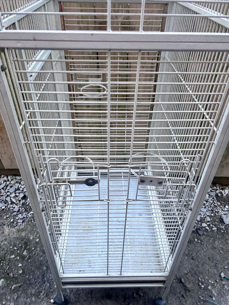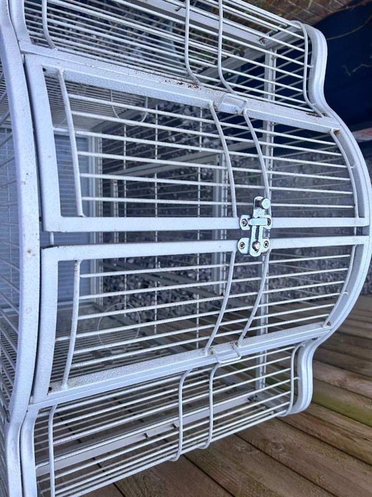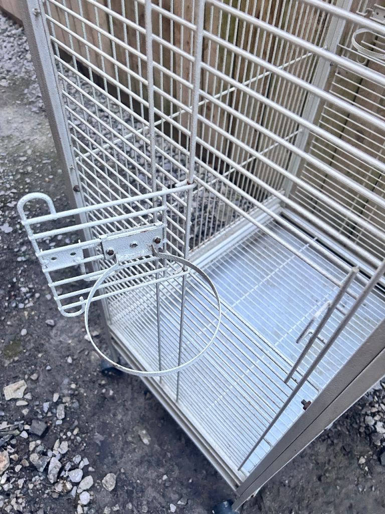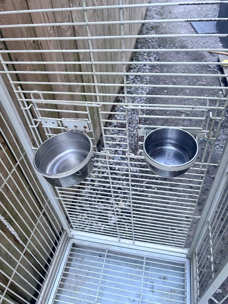 Large white bird cage with locking top and front doors as seen in the photos and side feeders with locking doors with two metal food or water bowls (the cage has slight discolouration due to age)