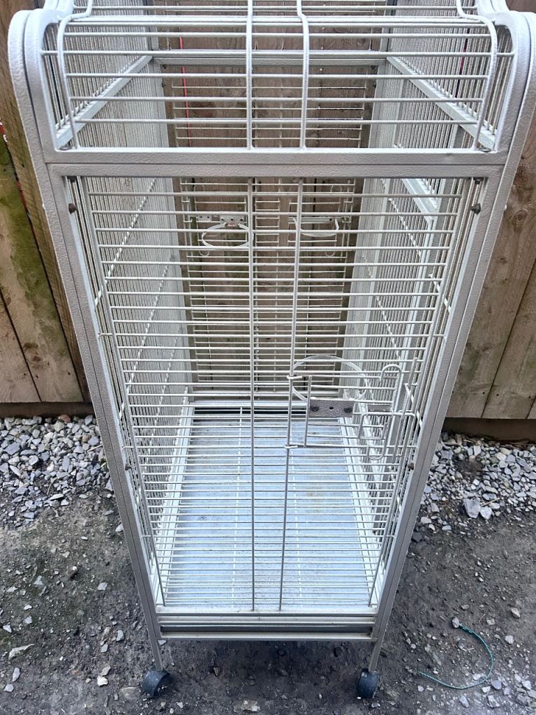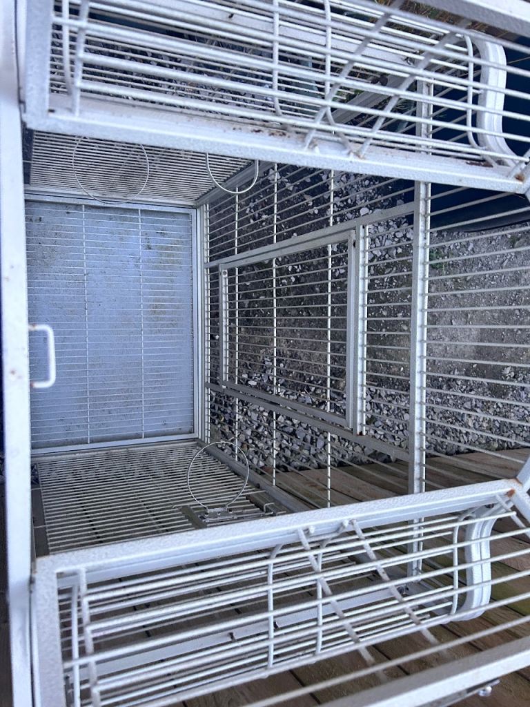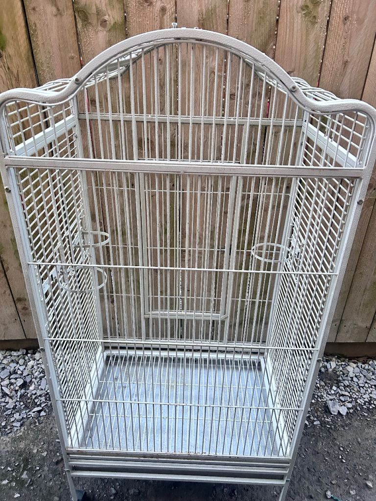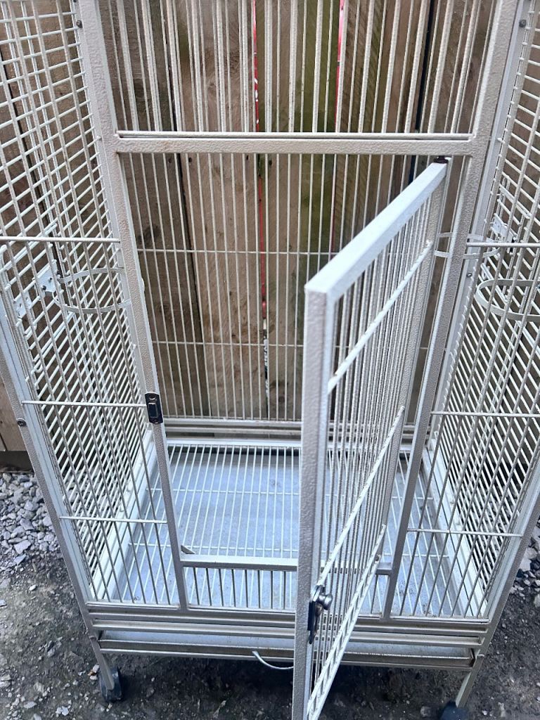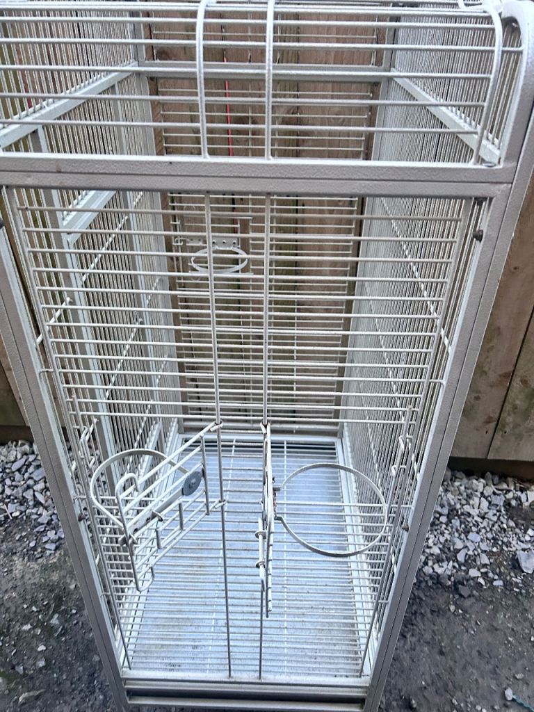 Large white bird cage with locking top and front doors as seen in the photos and side feeders with locking doors with two metal food or water bowls (the cage has slight discolouration due to age)