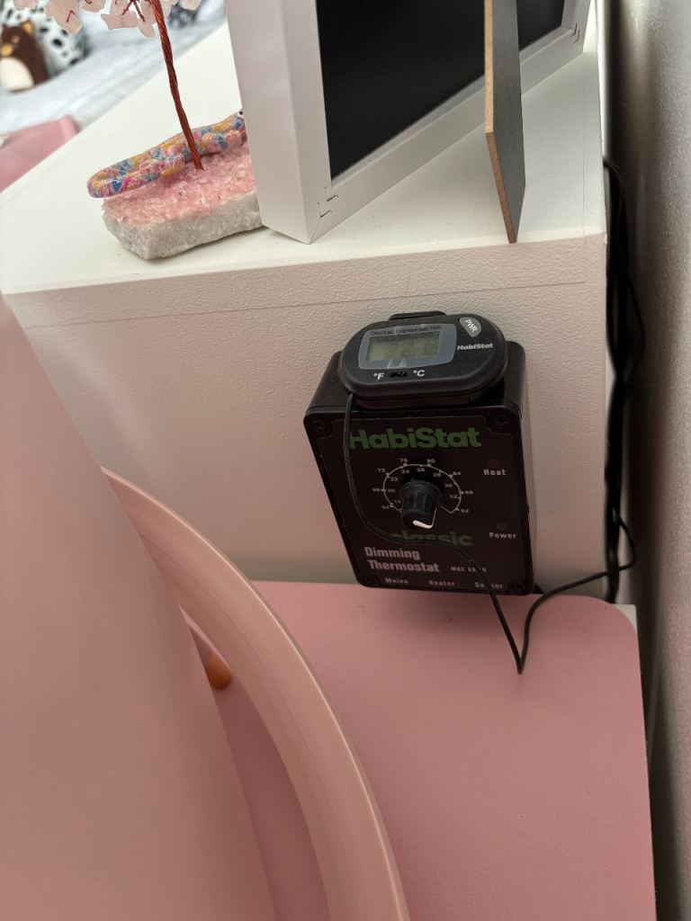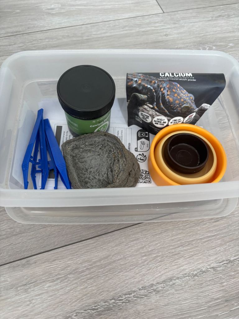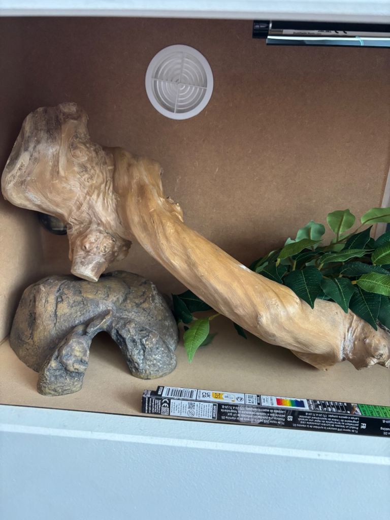 Very good condition. Whole set up for leopard gecko. Uv light and basking light only changed 4 weeks ago. Spare uv light. Thermostat. Cold hide and humid hide. Heat mat. Humidity thermometer .Calcium, tongs, bowls. Decor. Unopened sand 10kg.