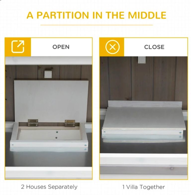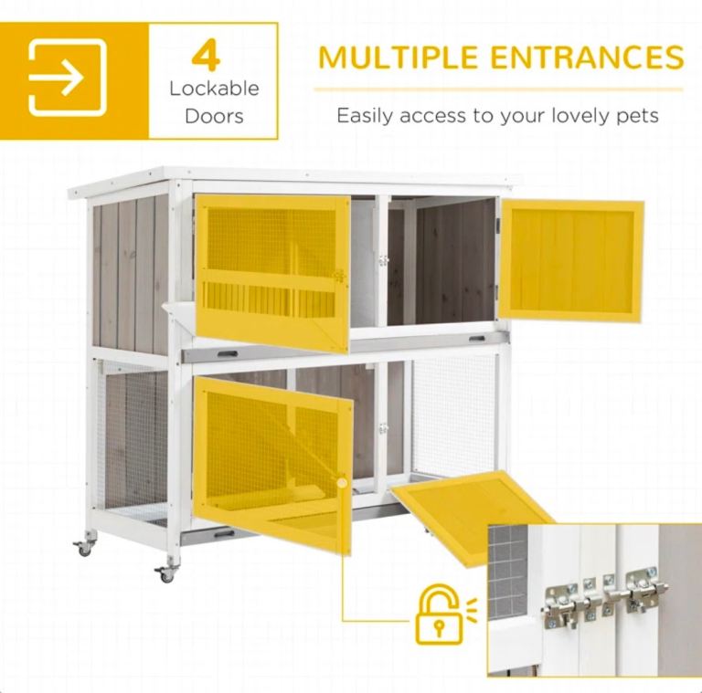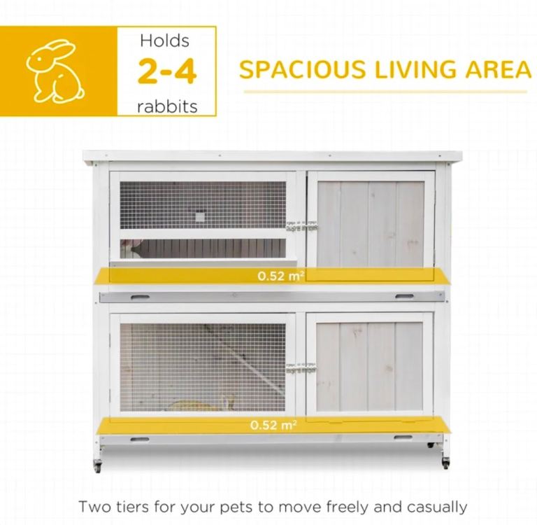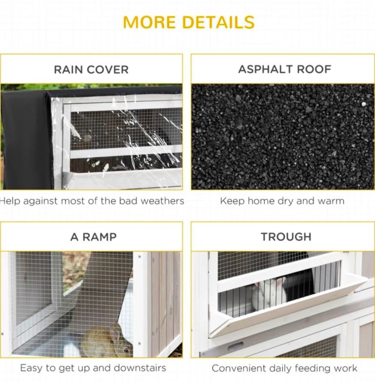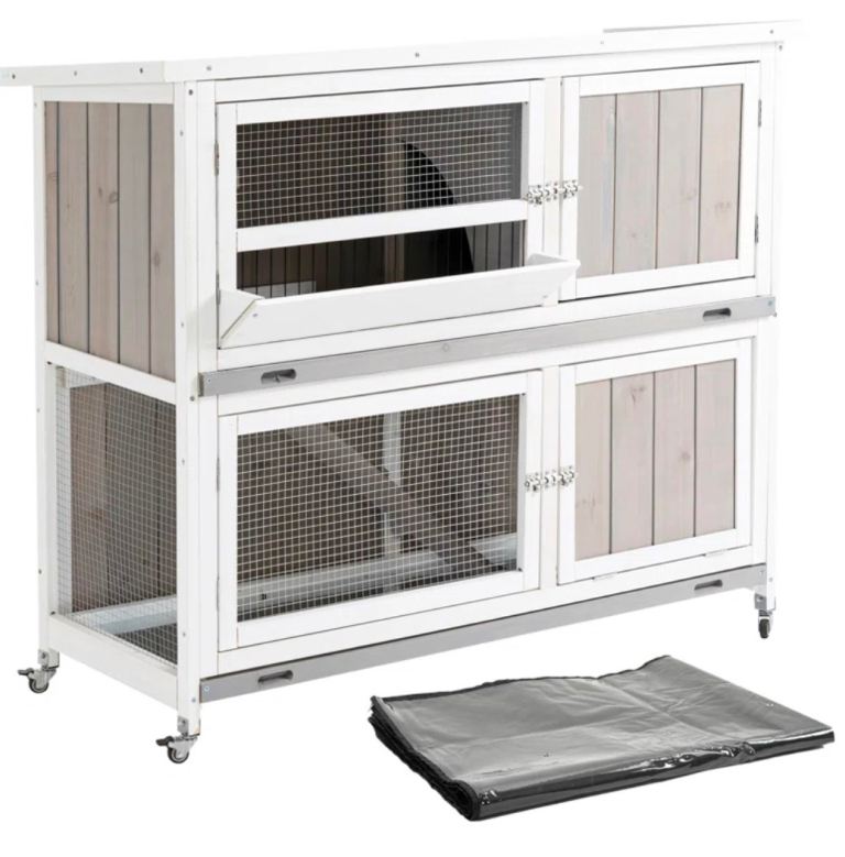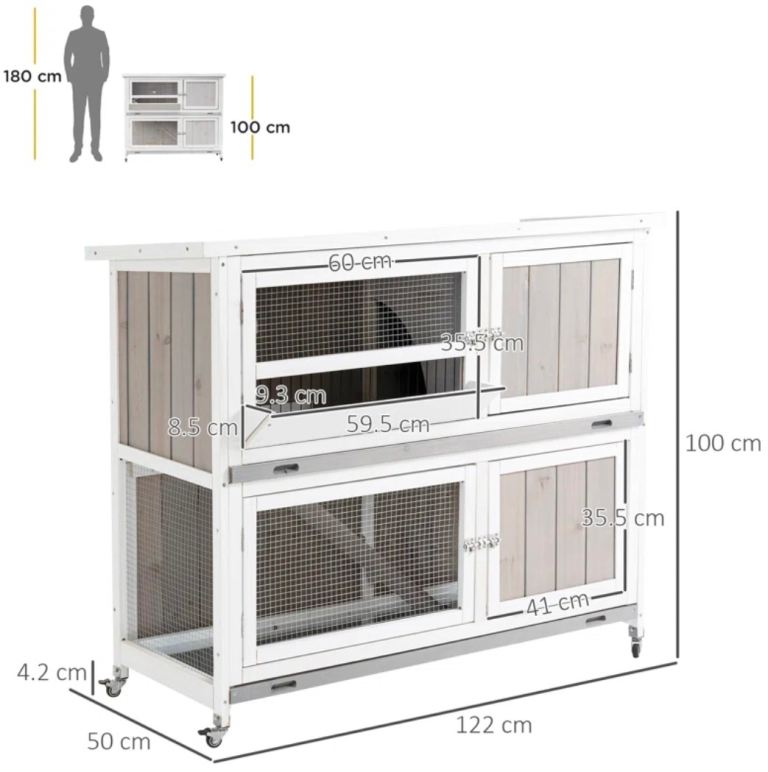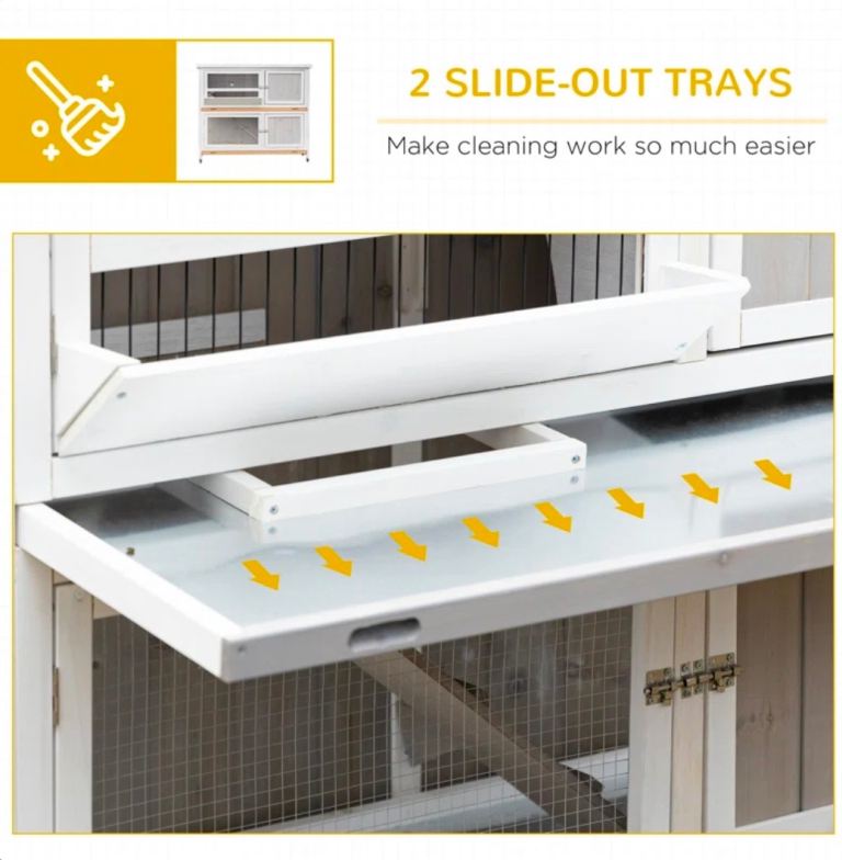 Two-tier rabbit hutch that can be used separately, ideal for small animals. Made of durable fir wood. Features mesh wire for ventilation. A cover is included to protect the hutch from wet weather non-slip ramp so pets and move between the two levels. A trough is included for daily feeding. Slide-out tray for easy cleaning. Wheels underneath for easy movement.