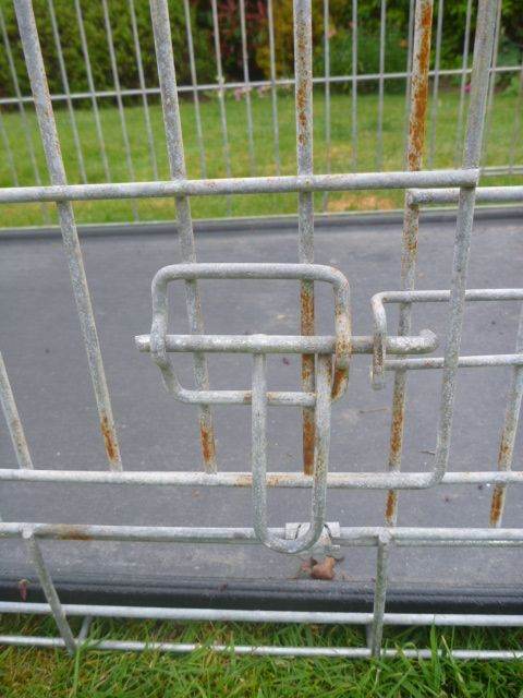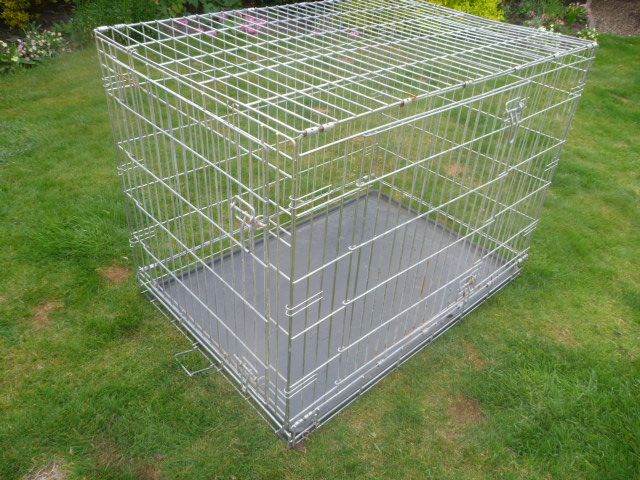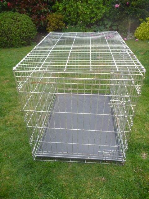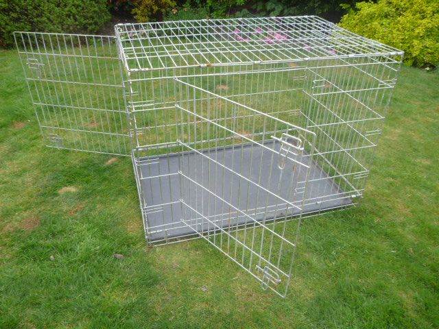 An XL dog crate, measuring 110 w x 72 d x 80 h cm. It has 2 doors and is super strong and very heavy. Folds flat for storage. Slight corrosion as shown
