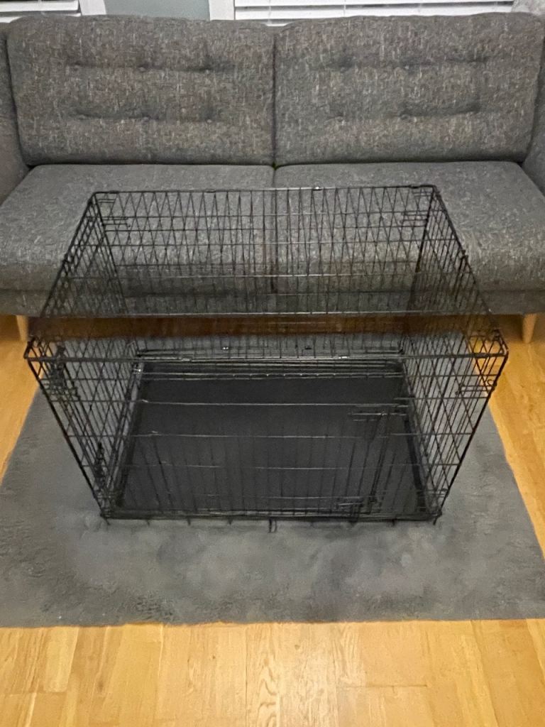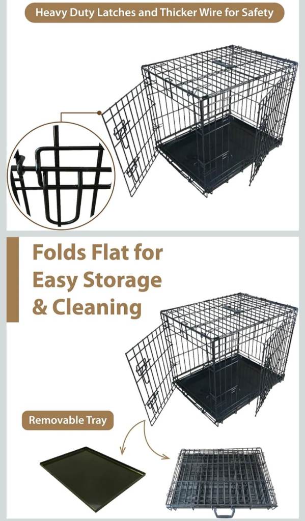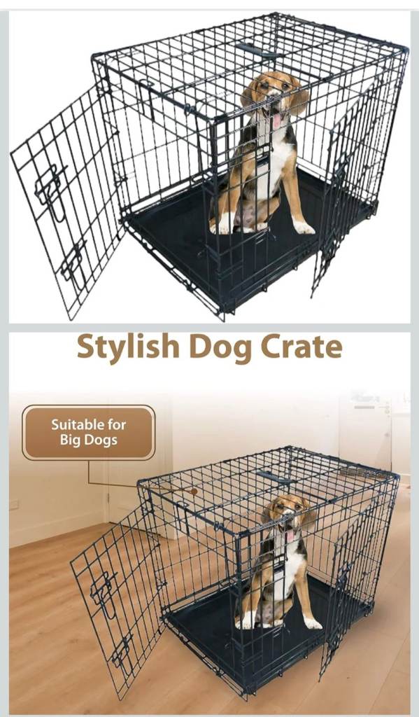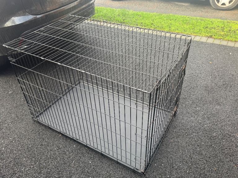 Dog crate suitable for large/extra large dog. Has 2 doors both have 2 locks, removable floor for ease of cleaning and folds flat to store. This has been used but has been disinfected and will cleaned out. Please ask for more photos if needed, product has been used - these retail for £50
