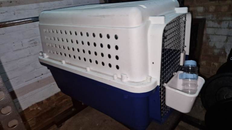 BB55 Dog Crate for sale Length 850mm x Width 560mm x Height 600mm has water bottle and tray for feed/water.