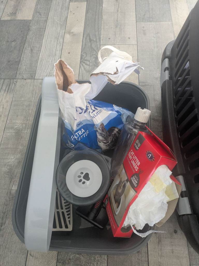 Cat carrier, litter tray, liners, litter, feeding/drinking bowls, grooming brush