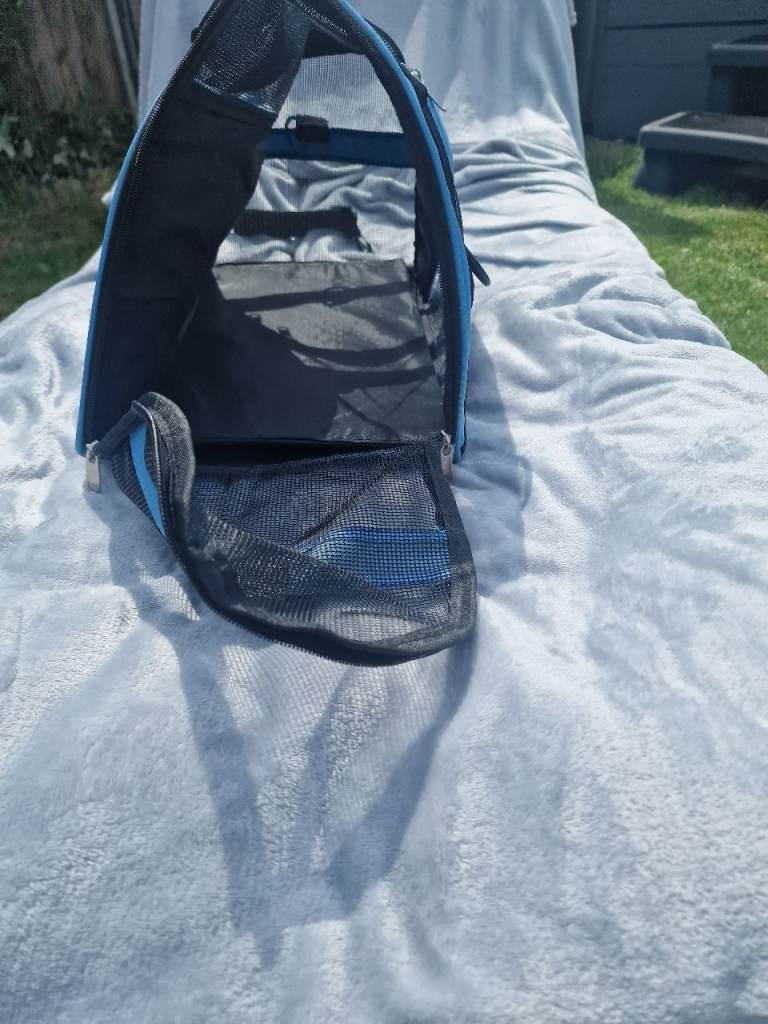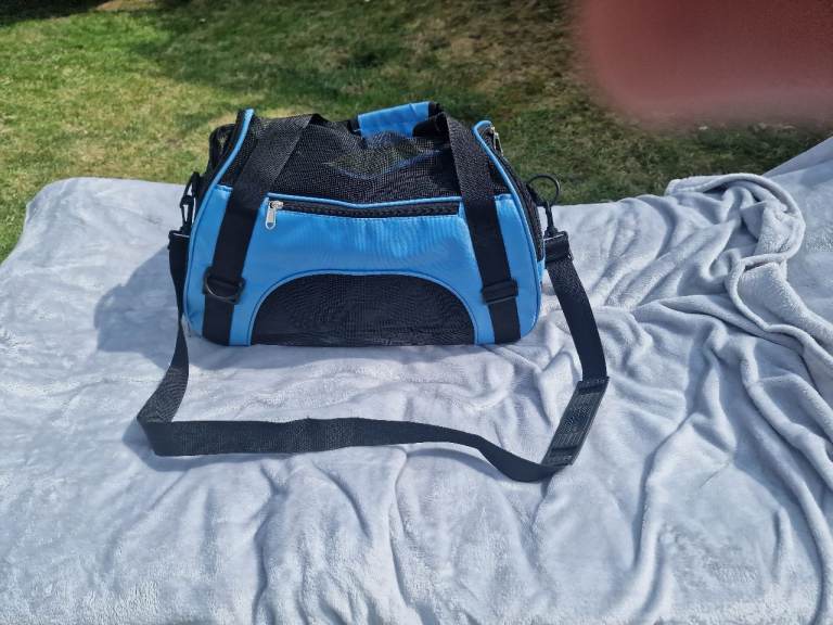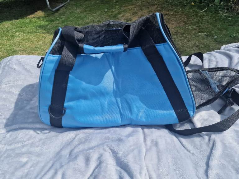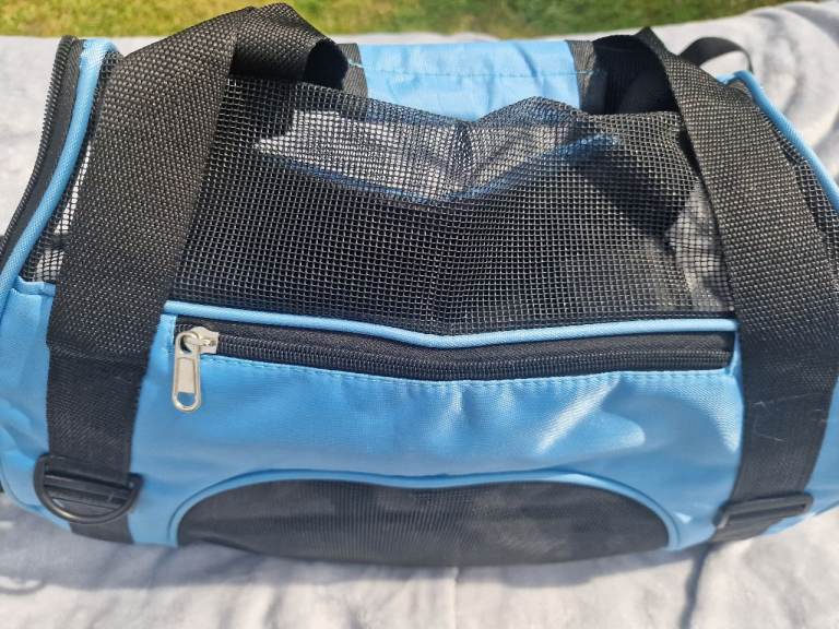 Blue cat carrier.zip openings at each end, zip up pockets on one side, two handles .