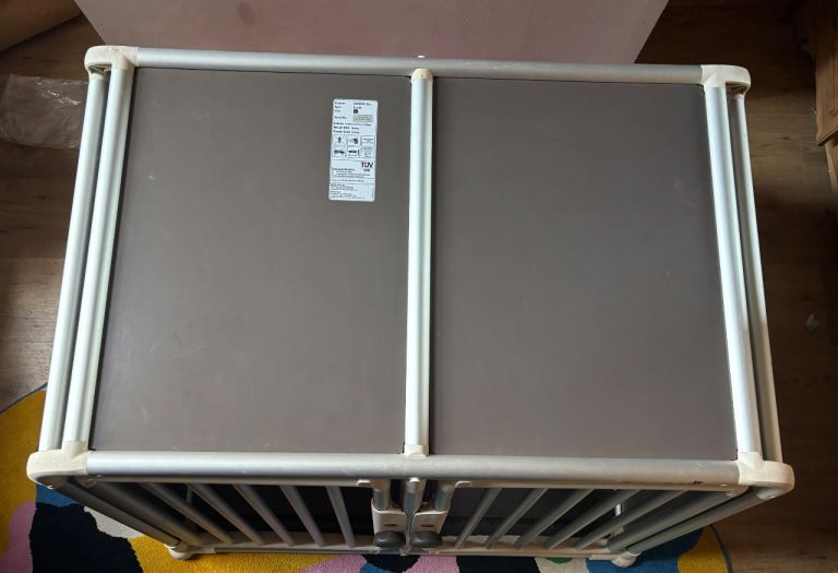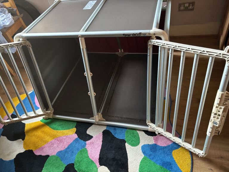 The Dog car cage, designed by 4Pets, is a large steel cage specifically made for carrying medium to very large-sized dogs in the car. The cage comes with a divider to make 2 smaller cages if transporting 2 smaller dogs. This car cage provides a safe and secure way to transport your furry friend, further tested for crash safety. With its sturdy construction and spacious design, it offers comfort and protection for your pet while on the road. Ideal for pet owners looking for a reliable and high-quality solution for transporting their canine companion. Originally bought for £800.