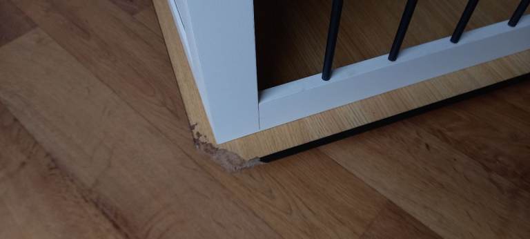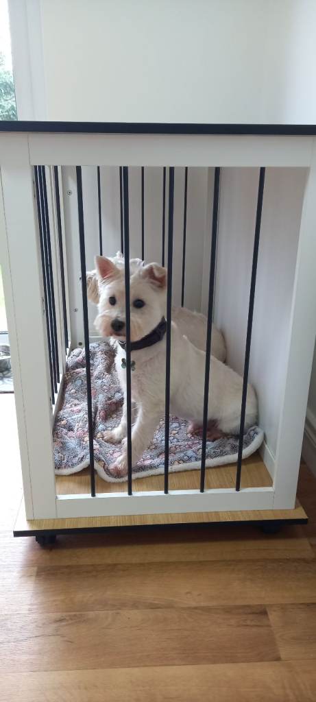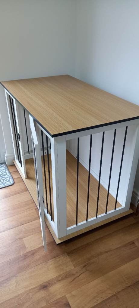 Dog crate with wooded top. 106 X 60cm and 81cm high. On locking wheels so easy to move and lock into position. Lovely practical furniture. Slight damage to rear but not too noticeable. £90
