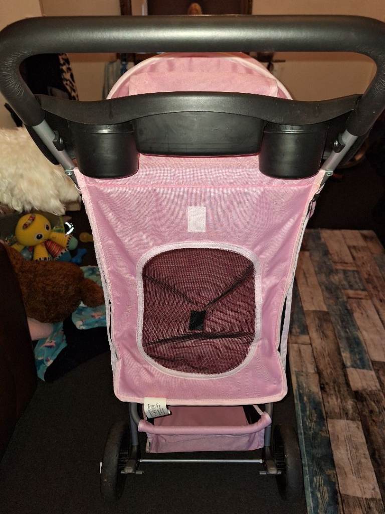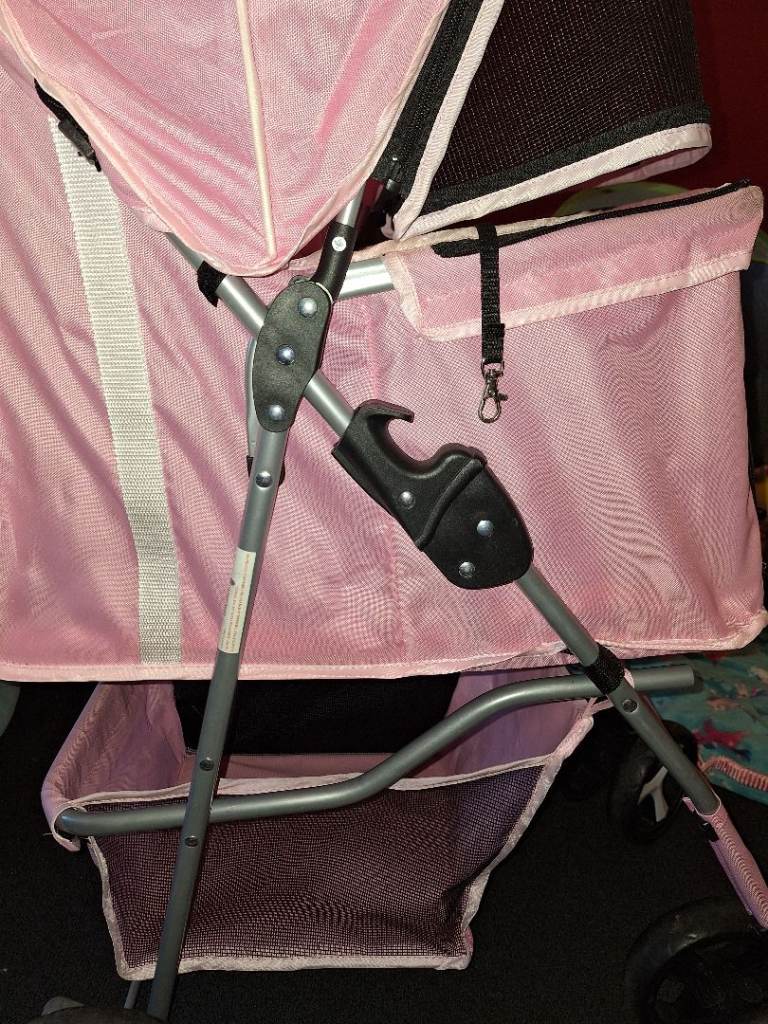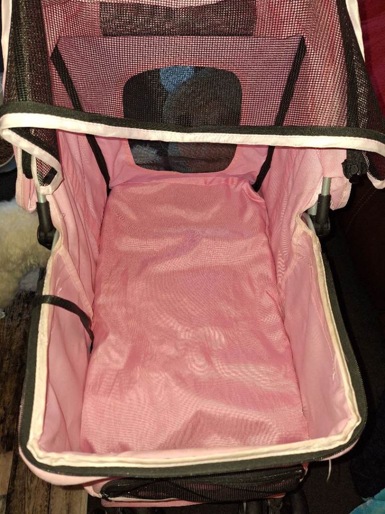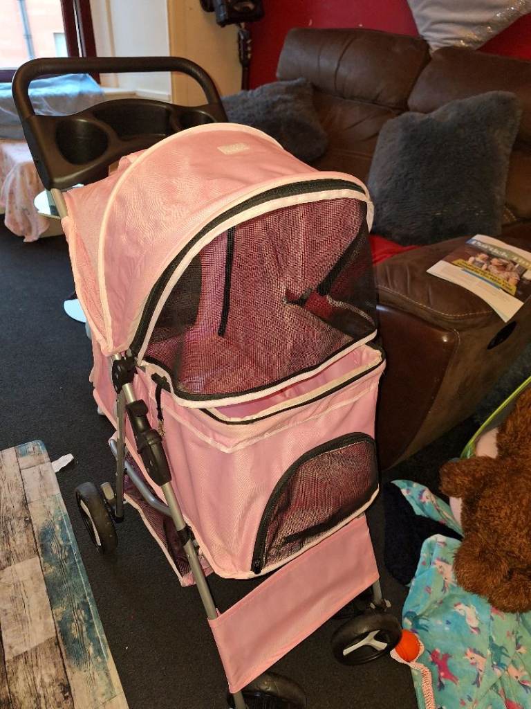 Great conditions light weight dog pram cup holder bit, rain cover which i bought separately zips up so your puppy/dog is safe inside and has clips to fastening them in pram so they can't jump out