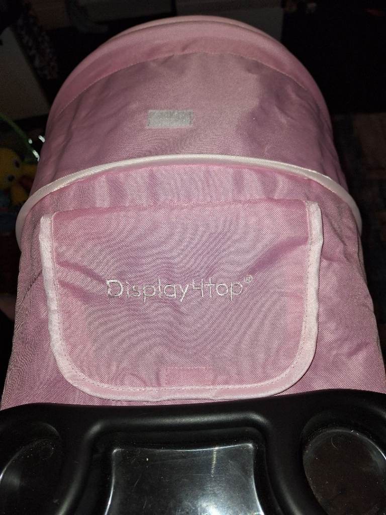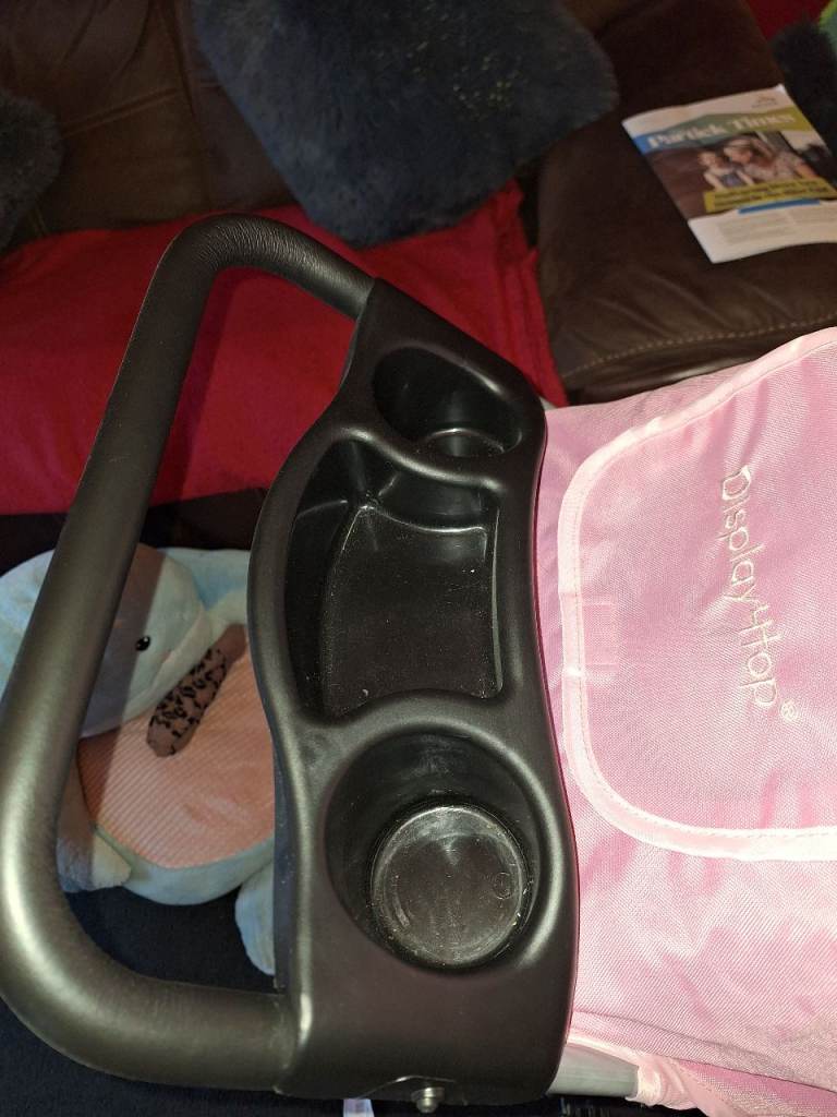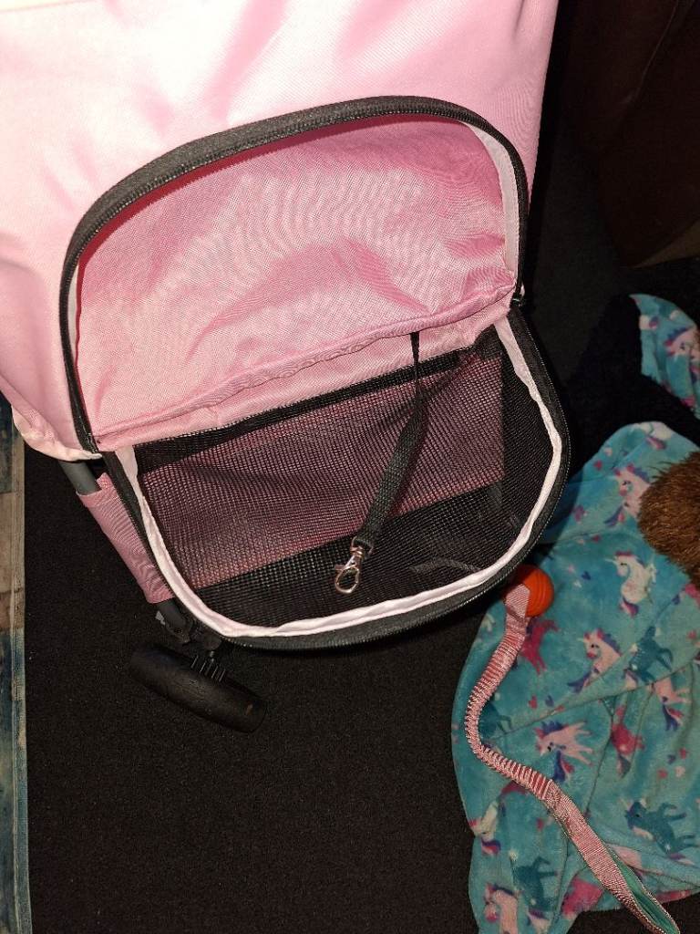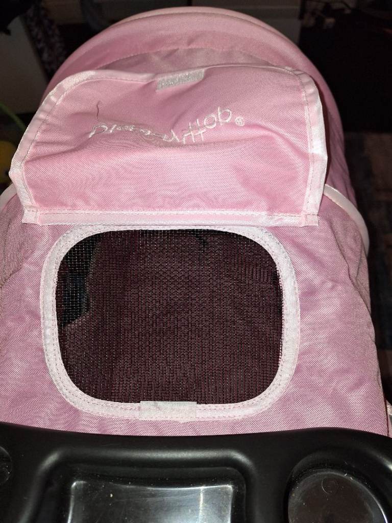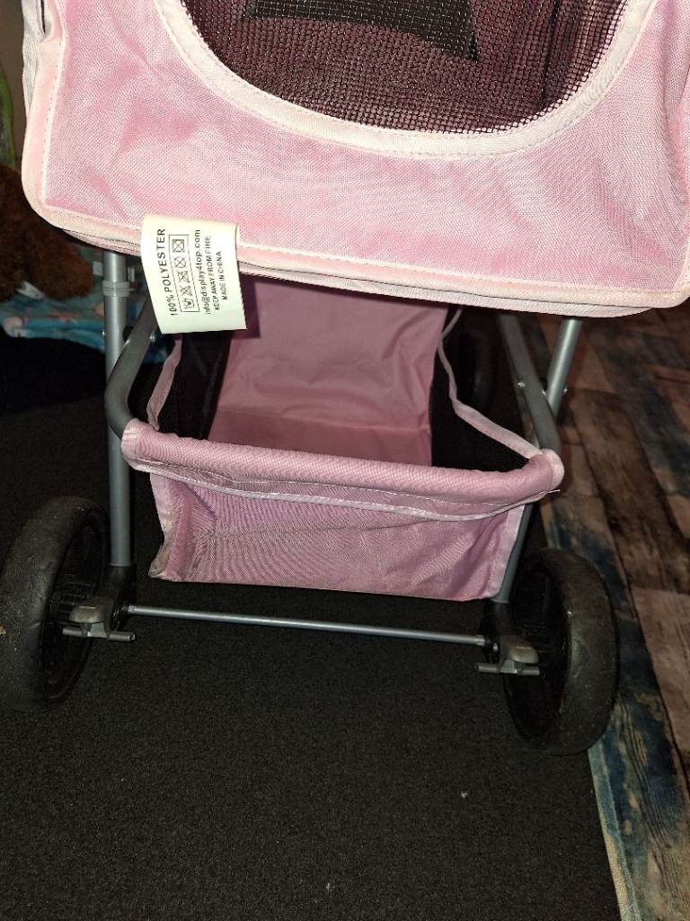 Great conditions light weight dog pram cup holder bit, rain cover which i bought separately zips up so your puppy/dog is safe inside and has clips to fastening them in pram so they can't jump out
