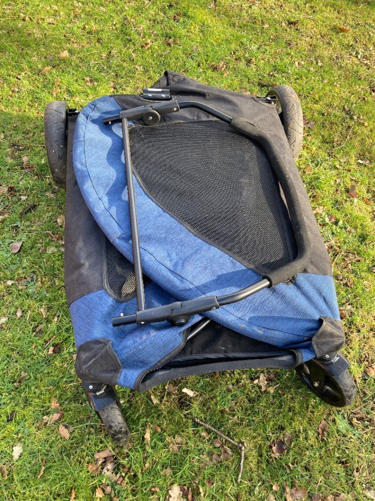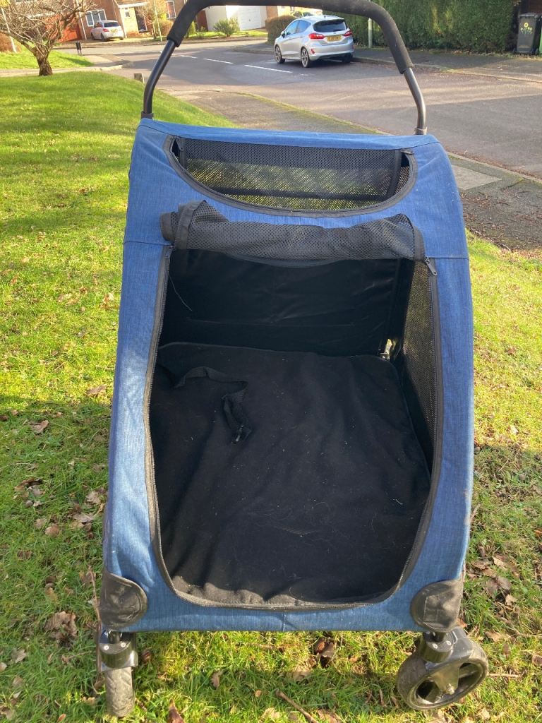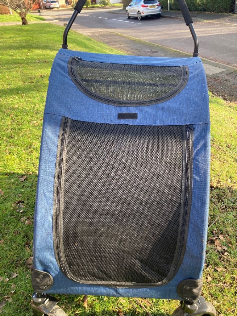 This is an essential piece of equipment for old or injured animals. We used for our puppy post surgery so she could still get out and about when limited to walking. It’s incredibly easy to manoeuvre and to collapse for transportation. Its size is good for a medium size dog max weight 80kg. Appreciate dimensions h 33 inches length 31inches width 23 inches. In good working order and condition. Comes with washable removable liner