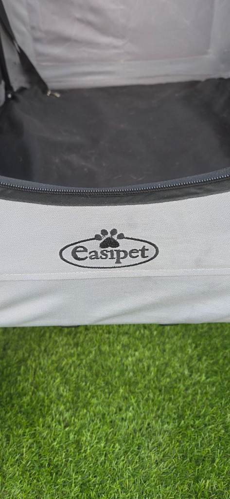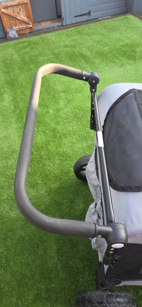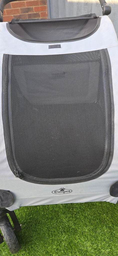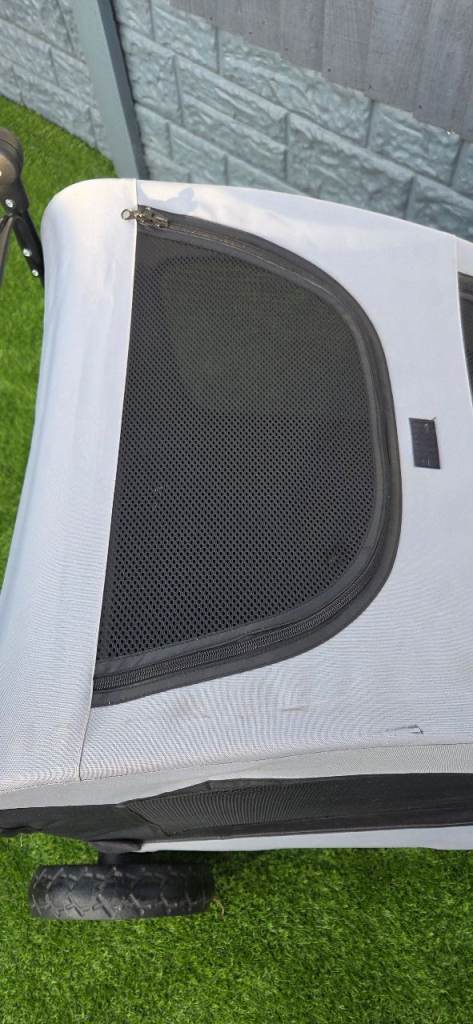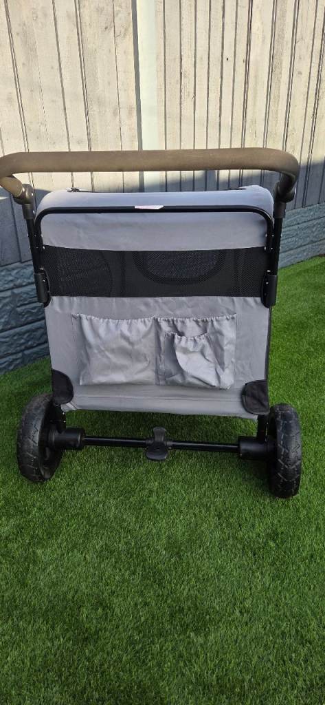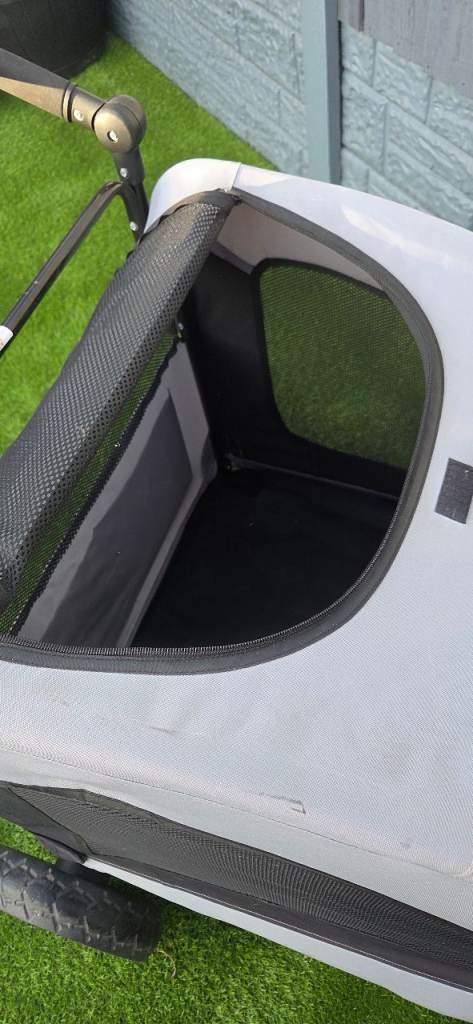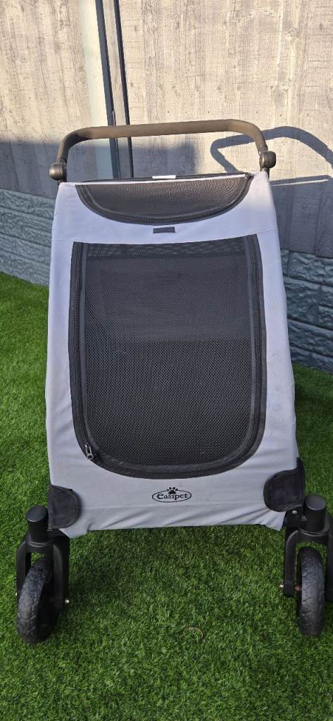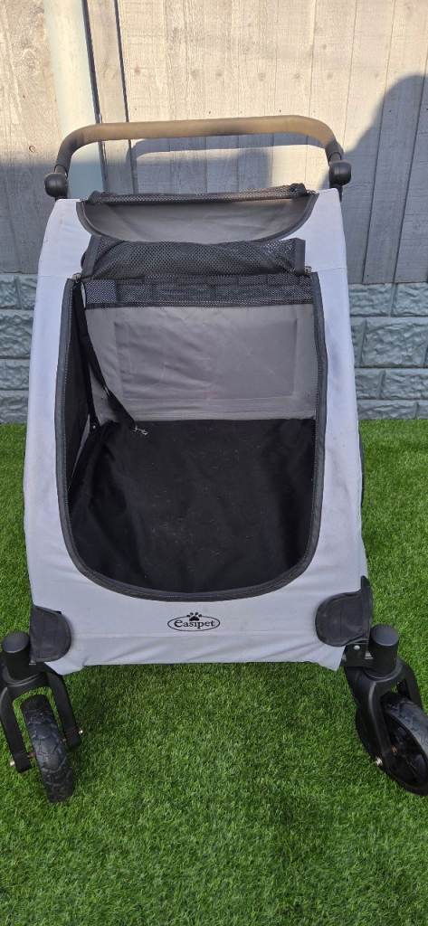 Easy pet dog stroller suitable for large dogs or 2 small. Folds flat for easy storage. Adjustable handle, 360 degree wheels, brake plenty of storage, main zip opening and also top zip opening with comfy waterproof cushion so your pet is snug. Excellent condition. I am reluctant to sell as its great quality its just too big for my dog. Chunky wheels so is good for all surfaces ie beach, fields . As you can see from the photos the wheels show no sign of wear amd have good tread.