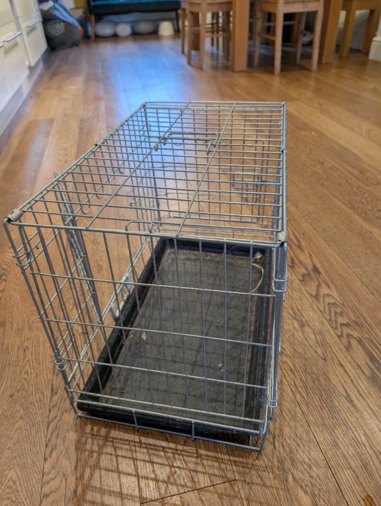 metal, folding crate for a small dog or cat or other pet. With plastic tray.