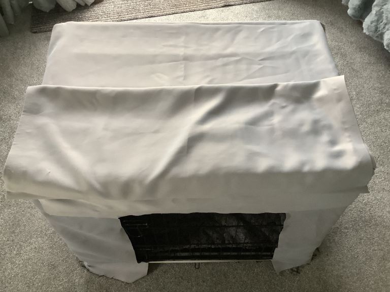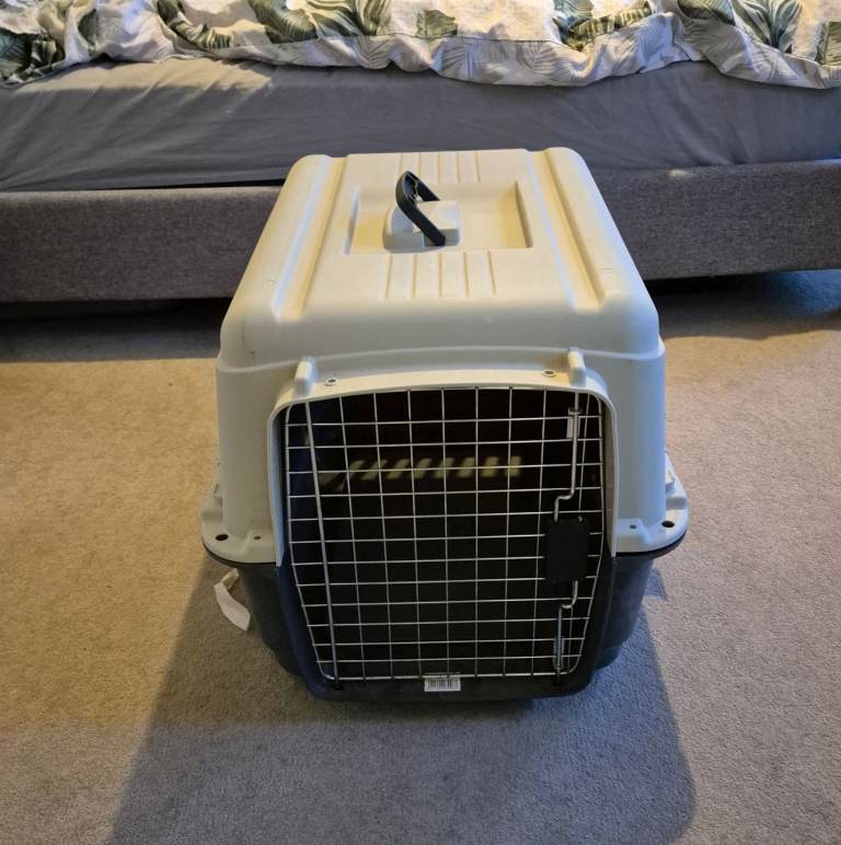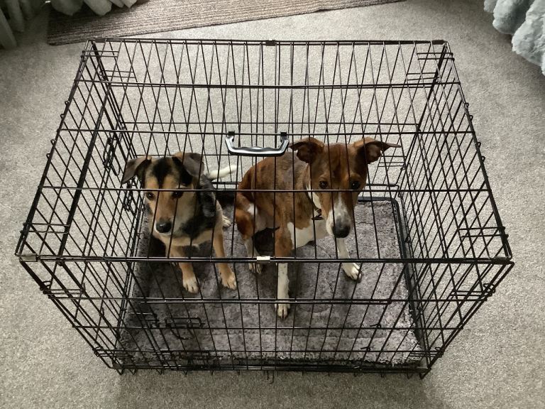 Metal dog crate with plastic tray and felt bedding. 75cm wide x 52cm deep x 61cm tall. About 5 years old, in good, clean condition. Folds easily for moving. It also has a cover (home made) that fits neatly over it and allows access to the main door. Dogs not included!