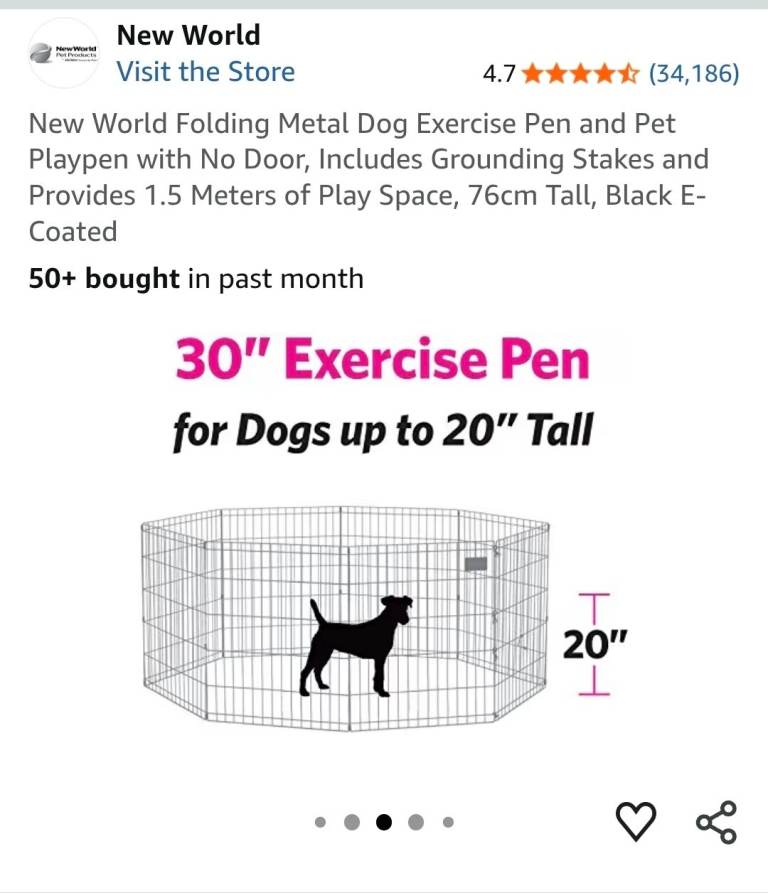 New World Folding Metal Dog Exercise Pen and Pet Playpen with No Door, Includes Grounding Stakes and Provides 1.5 Meters of Play Space, 76cm Tall, Black E-Coated.