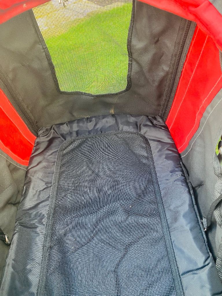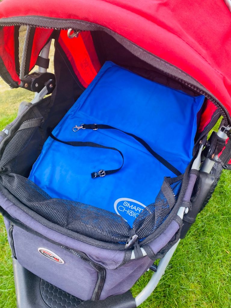 It’s sturdy unlike the cheap ones it has a solid base for good back support for your pet. There are two safety belts. Rosie jumped straight out the first time, after which she loved it.
