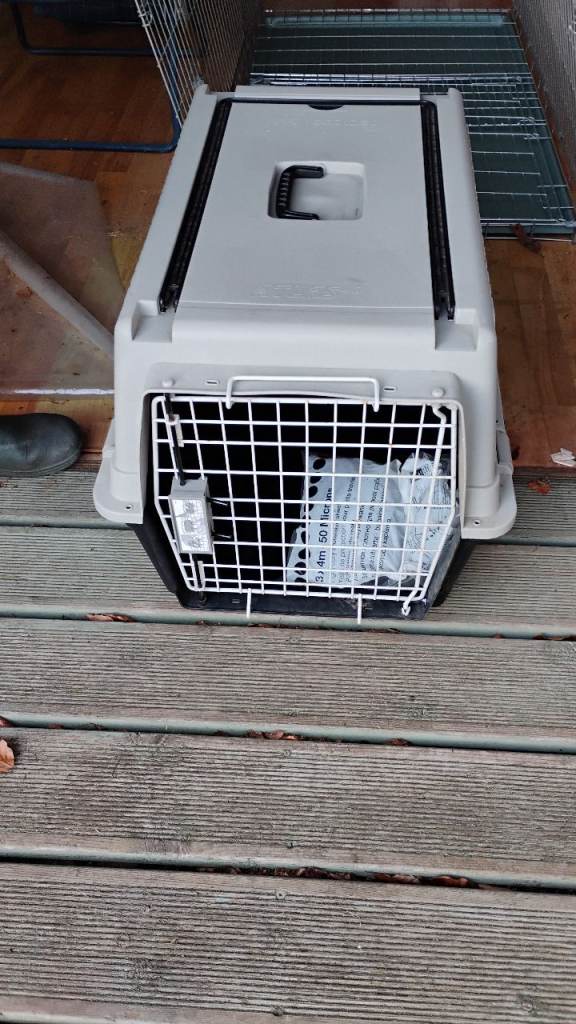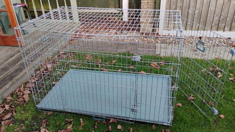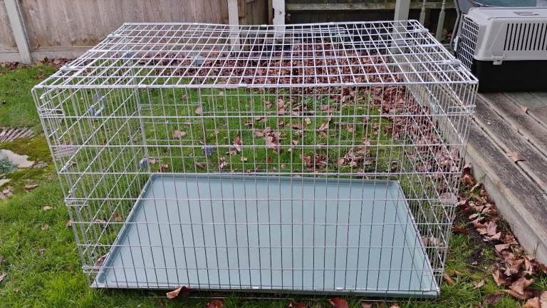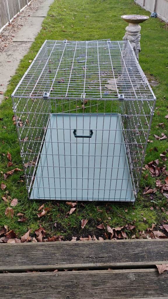 Solid large dog crate with removable tray for cleaning. 3 openings with clip locks and with carry handles. Measurements are 122cm length, 75cm depth, and 82cm high. Folds flat for storage. Exceptionally clean, our beautiful Cavapom only used it now and then when we went out. Even so it has been cleaned thoroughly. Open to offers. There is a medium sized pet carrier which can be sold separately which is also open to offers, again very clean.