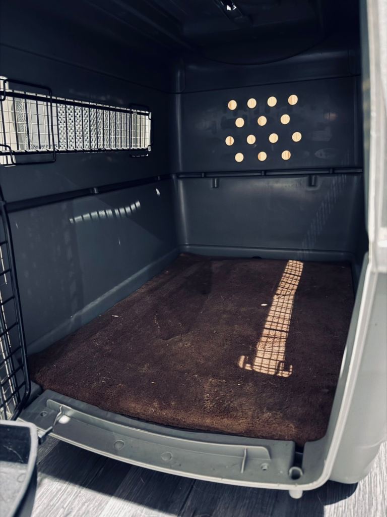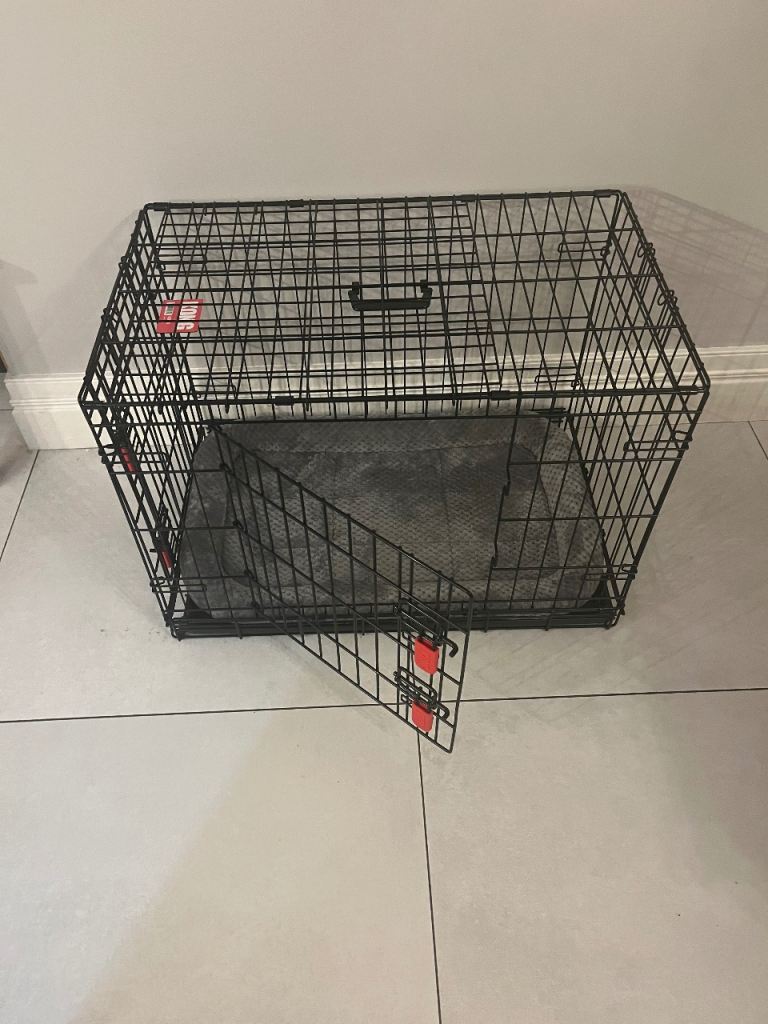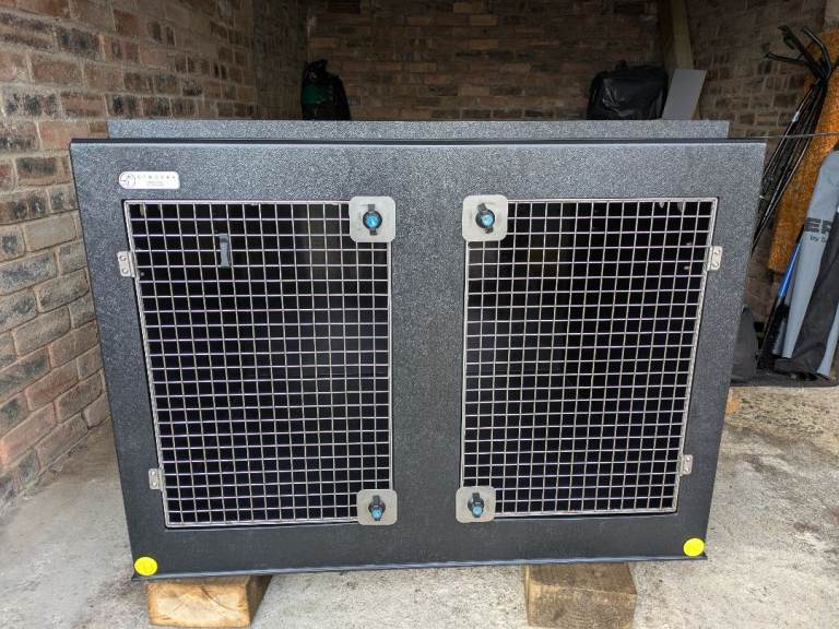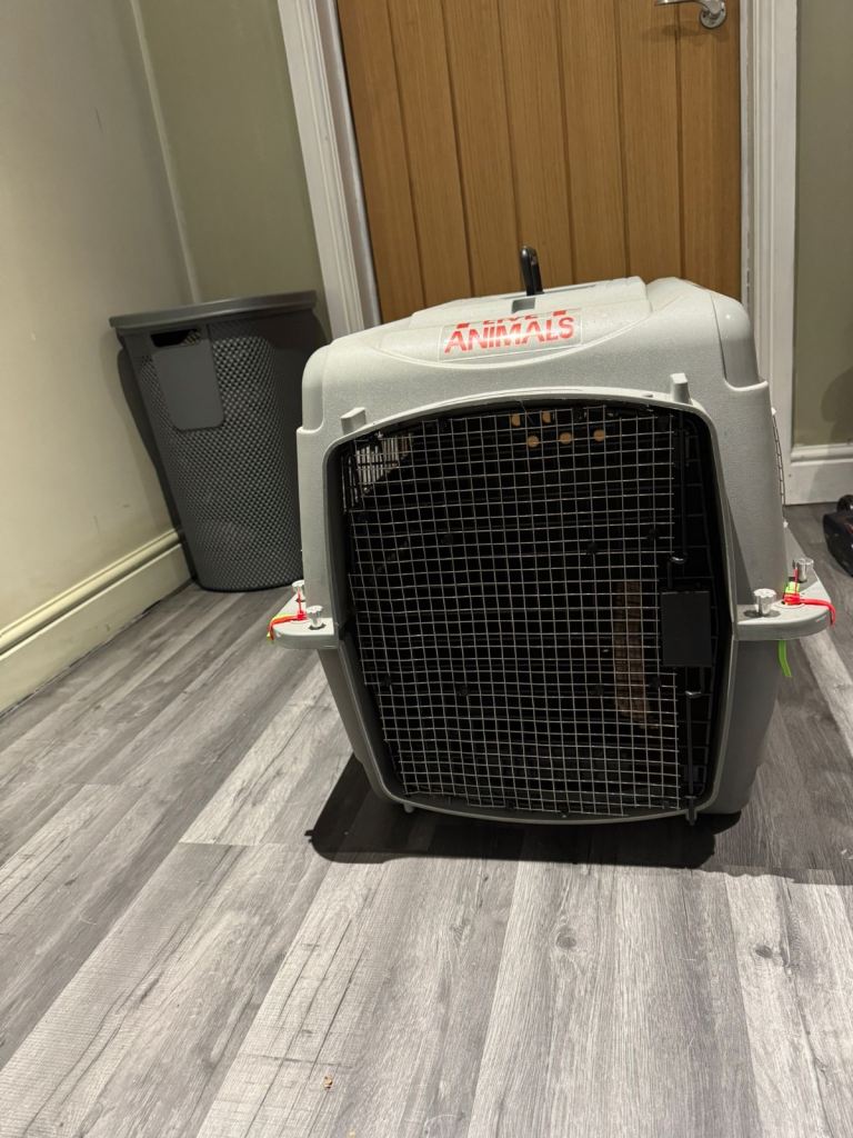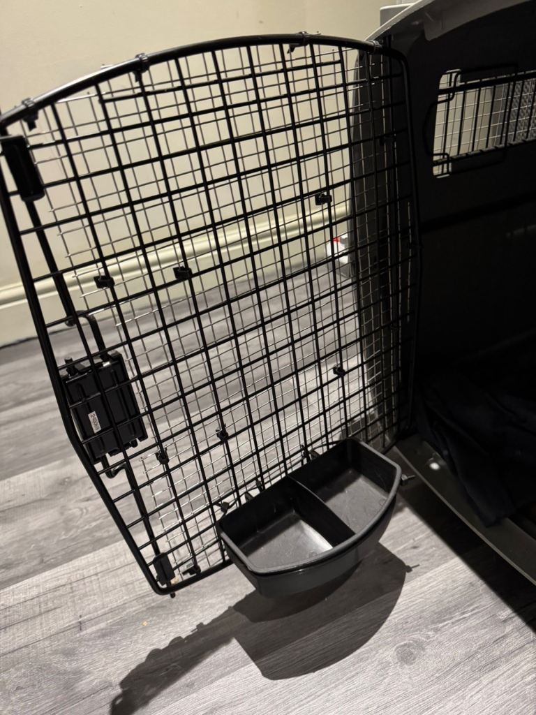 Strong, airline-style plastic crate with metal door, side ventilation and secure fastenings.Includes attached food/water bowl on the door.Clean inside with no cracks – door and locks work properly.Suitable for medium to large dogs, home use or travel.