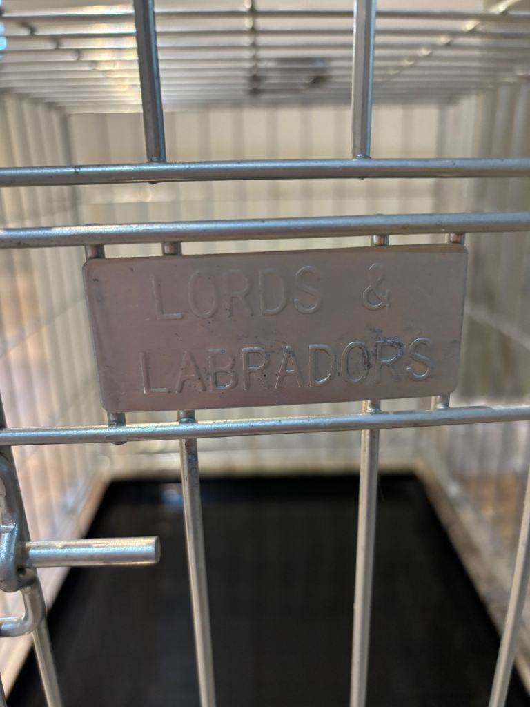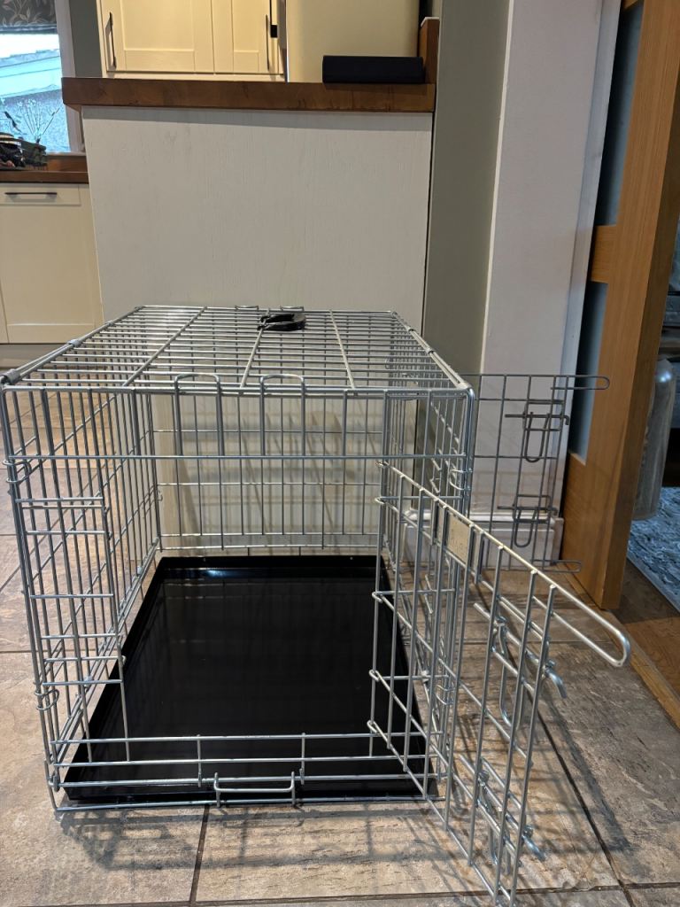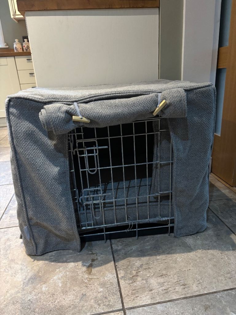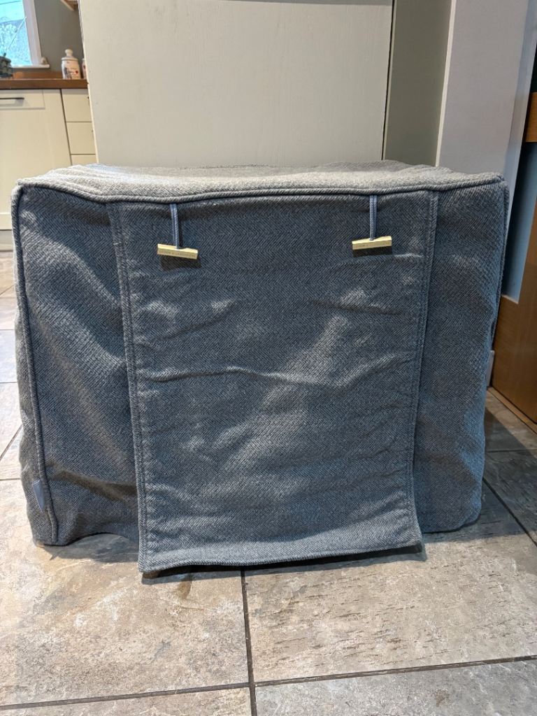 Beautiful lord’s labours crate bed in pewter herringbone tweed, includes dog crate cushion, bumper and cover. Size small Length 2ft by 1.5ft wide height is 21in very good condition.