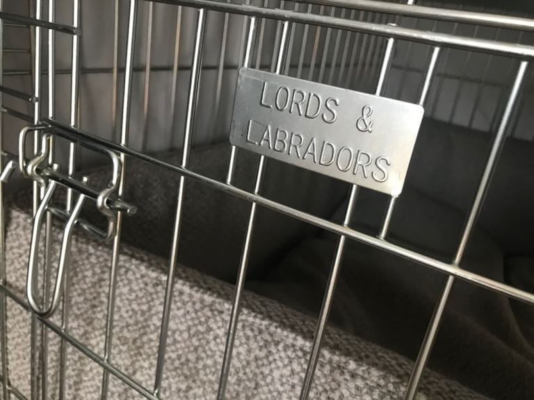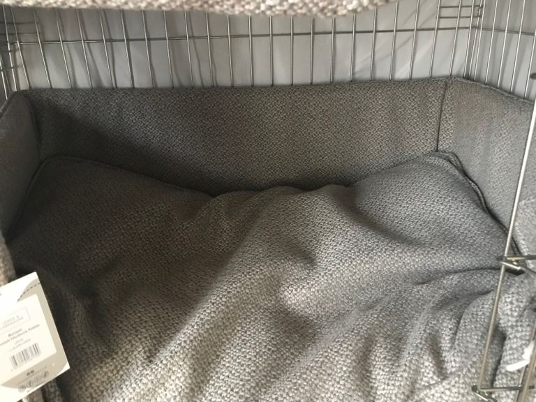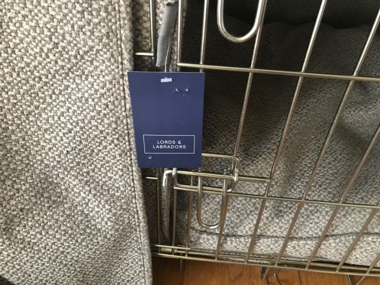 Brand New Lords and Labradors Large silver crate and Herdwick Pebble bedding including cover, bumper and cushion.