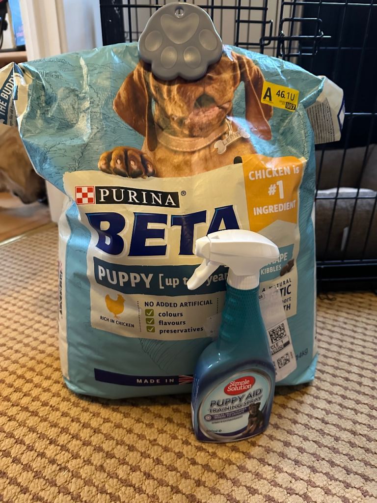 Half bag of Beta Puppy Dog feed & Puppy Aid training spray.