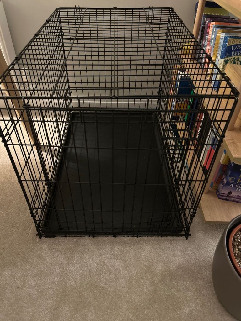Medium dog crate, less than two weeks old. Very good condition, very clean, and full working order. 63cm high, 58cm wide, 93cm depth. Bought from pets at home.