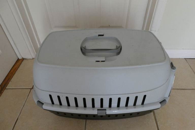 Plastic cat or dsmall dog carrier measuring 50cm x 35cm x 38cm.