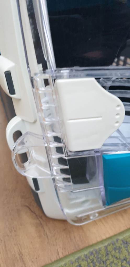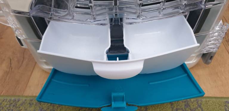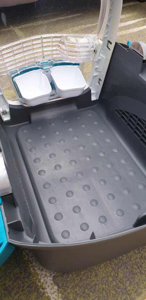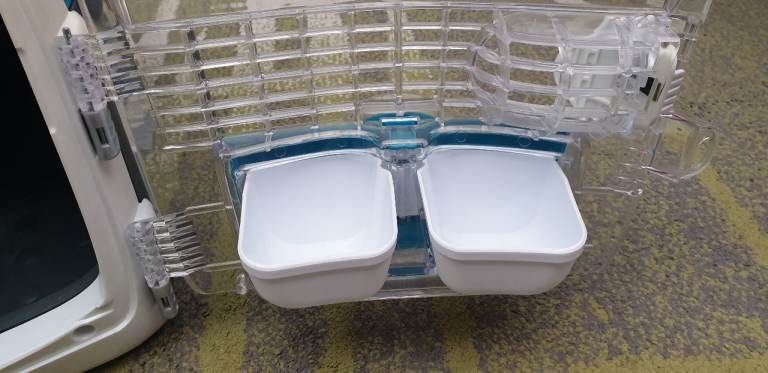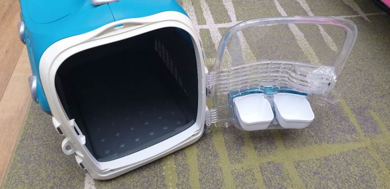 The Catit Cabrio pet carrier. Thoughtfully constructed, the Catit Cabrio carrier was specifically engineered for cats and designed to keep them safe, comfortable and most importantly secure while travelling. External access to the removable food bowls reduces the risk of your pet escaping. The skid-resistant textured floor will help prevent sliding and when carried the integrated molded handle will help to reduce pet motion sickness. Access to the carrier from the front or by releasing the two top locking catches and placing your pet in from the top.