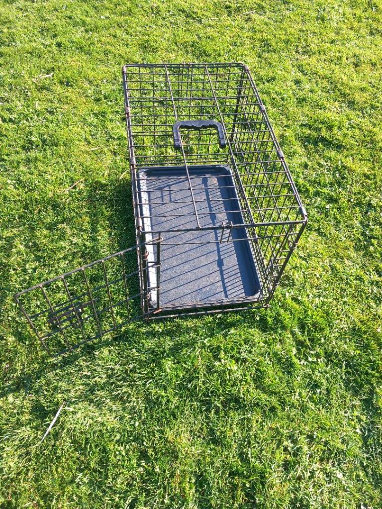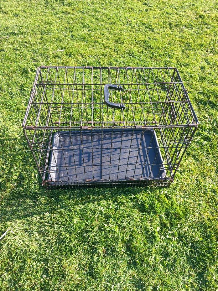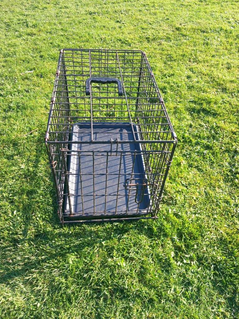 A small pet, dog crate in good used condition. Photos attached. It measures 13" wide x 22" long x 16" high and folds flat for ease of transportation and storage. Am happy to deliver locally if need be.