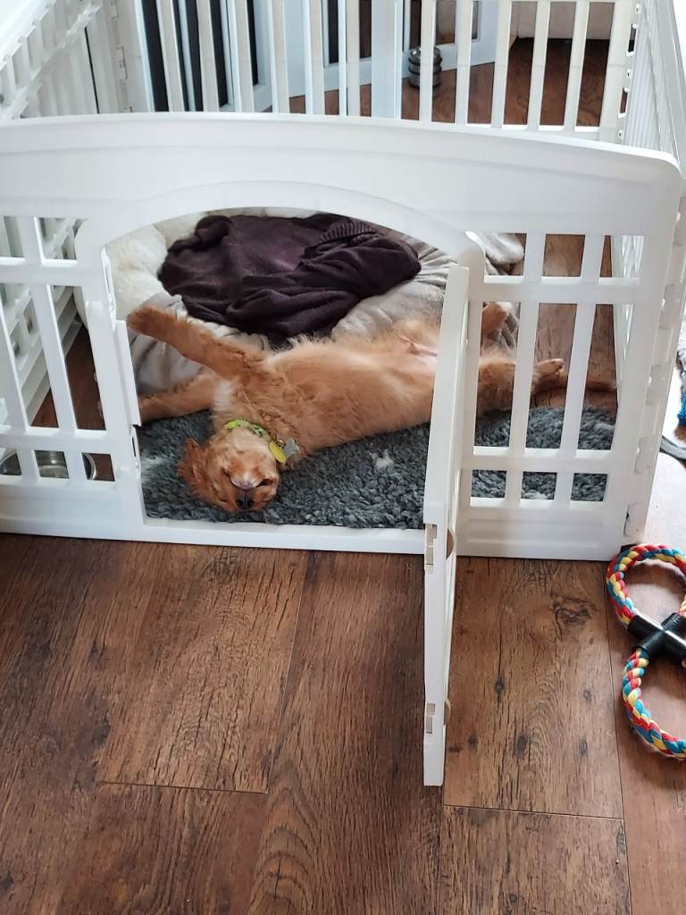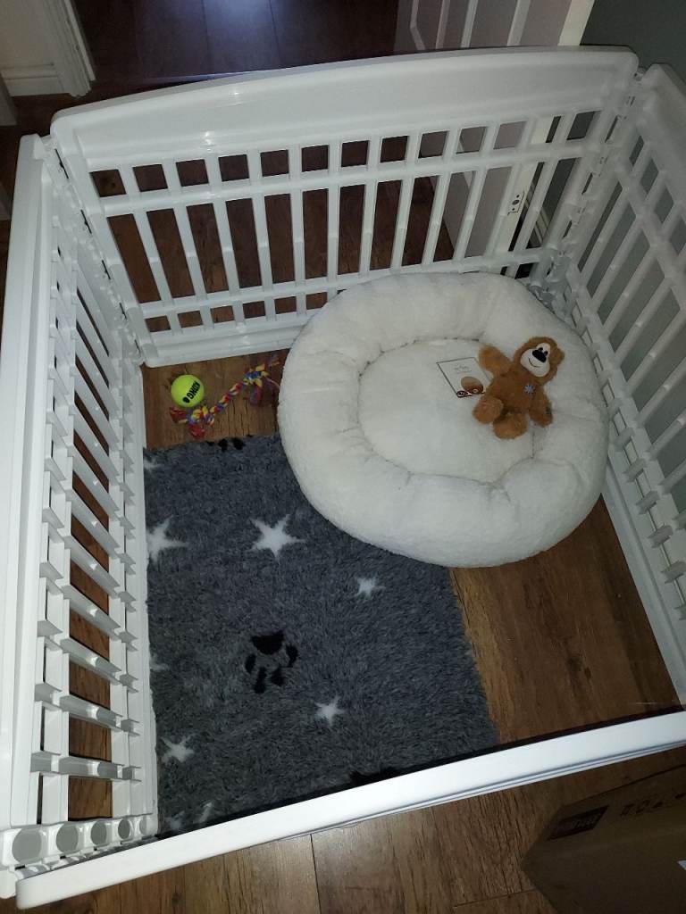 White plastic puppy Pen, with open top. Was great for our puppy. We could leave the door open during the day to let him in and out and close up at night night. It's collapsible as the parts connected together. Has rubber grips added at the bottom to prevent movement but would recommend having within a corner of the room. We also used some weights to prevent movement when the puppy got a bit older.