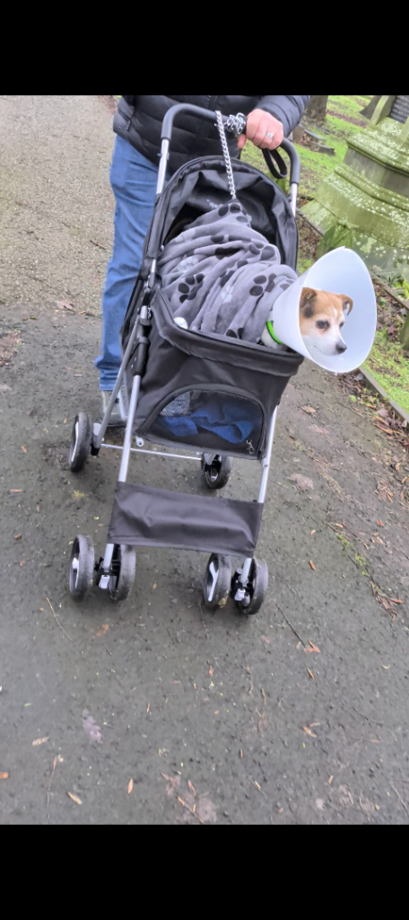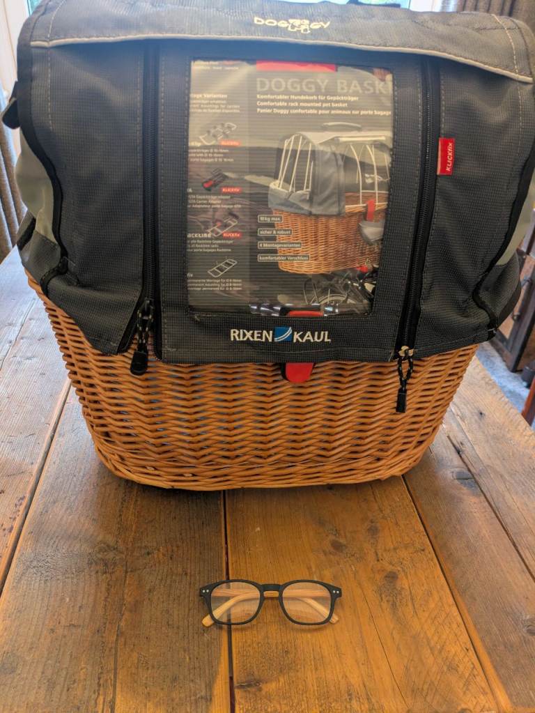 Top quality doggy basket for small dogs, photo with glasses to give sense of size.